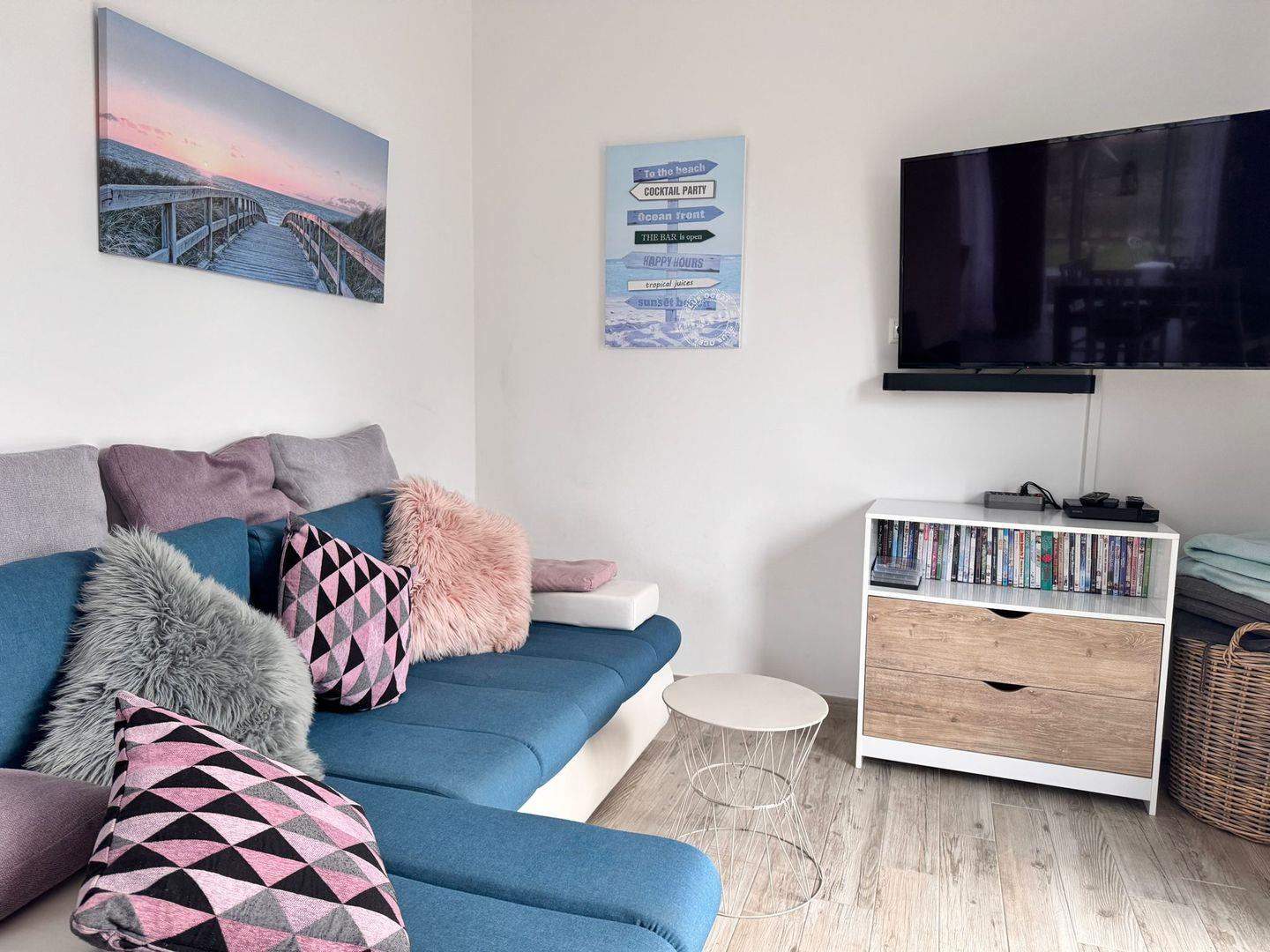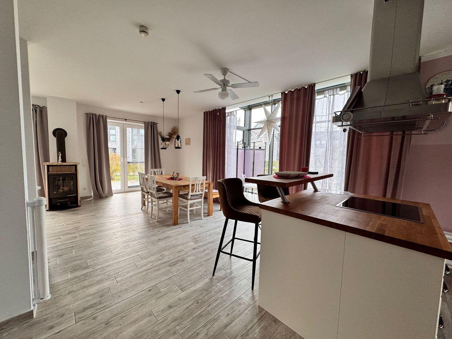 Die hellen Wohnräume erstrecken sich über zwei Etagen und sind mit hochwertigem Vinylboden ausgestattet, der ein angenehmes Wohngefühl vermittelt. Im Wohnzimmer erwartet Sie eine gemütliche Sofaecke mit Kaminofen, der an kühleren Tagen für wohlige Wärme sorgt. Für Unterhaltung stehen drei Fernseher (1x Wohnzimmer und je 1 Fernseher in 2 Schlafzimmern) mit Satellitenanschluss, ein Radio, WLAN sowie eine Auswahl an Büchern, Spielen, DVDs und ein DVD-Spieler zur Verfügung.