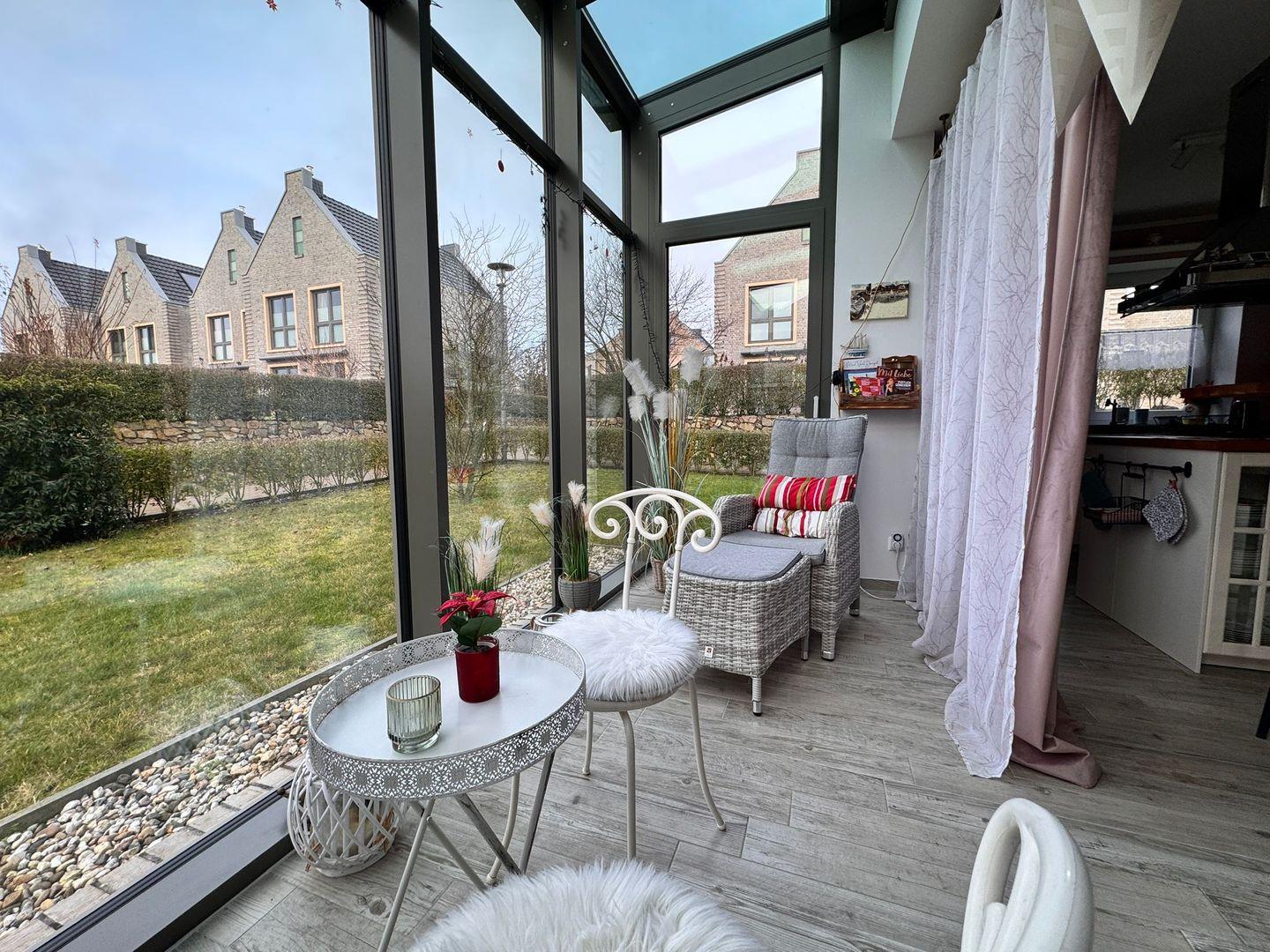 Ein besonderes Highlight ist der private Wintergarten, der einen ruhigen Rückzugsort für entspannte Stunden bietet. Die angrenzende Terrasse mit Gartenmöbeln, Sonnenliegen, Sonnenschirm und Liegewiese lädt dazu ein, die frische Nordseeluft zu genießen oder ein ausgedehntes Frühstück im Freien zu verbringen. Der gepflegte Garten ist ideal für Kinder zum Spielen und Erholen.