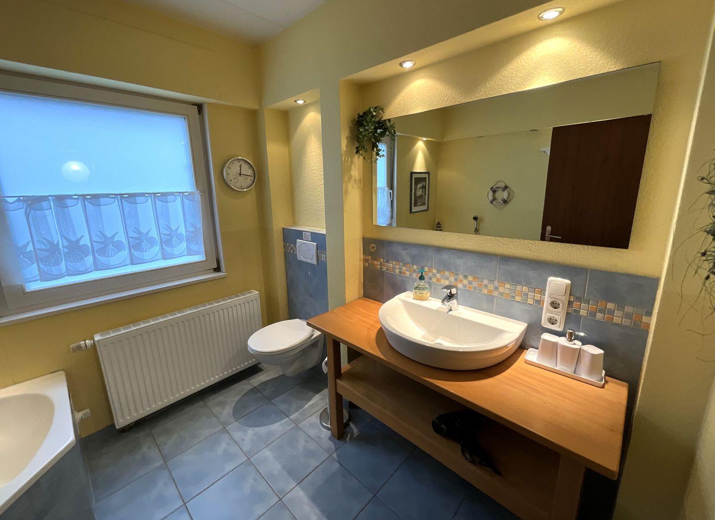 Mit 3 Badezimmern ist auch bei voller Belegung Komfort gewährleistet. Zusätzlich ist eine Badewanne vorhanden. Tageslicht durch Fenster, Haartrockner sowie warmes Wasser gehören zur Ausstattung.