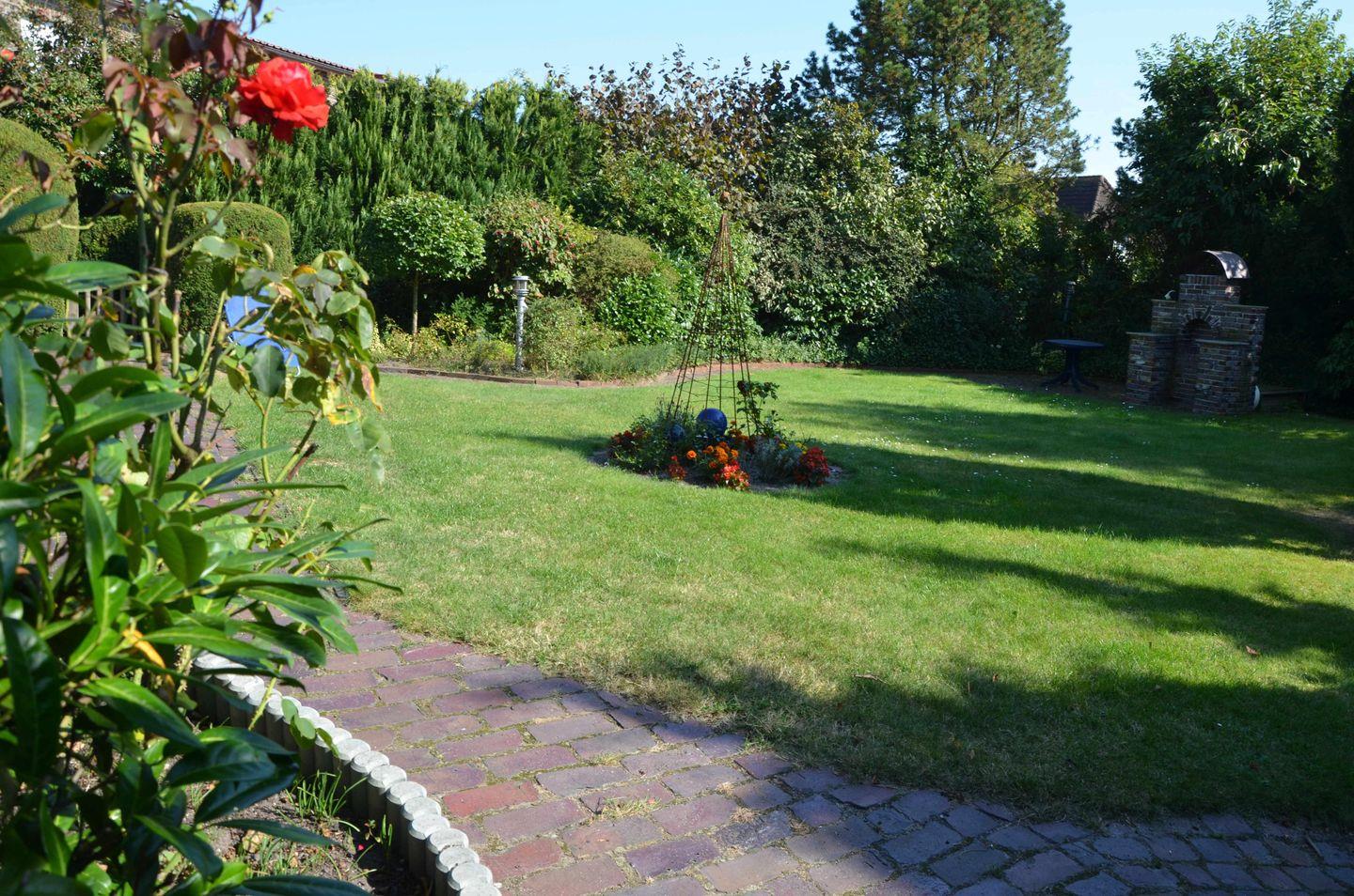 Draußen genießen Sie Terrasse und Garten mit Gartenmöbeln; ein Sandkasten macht den Außenbereich auch für Kinder attraktiv. Das Grundstück ist abgeschlossen und eingezäunt (kinder- & hundesicher), ein Kohlegrill steht bereit. Ihr Fahrzeug parken Sie in der Garage.