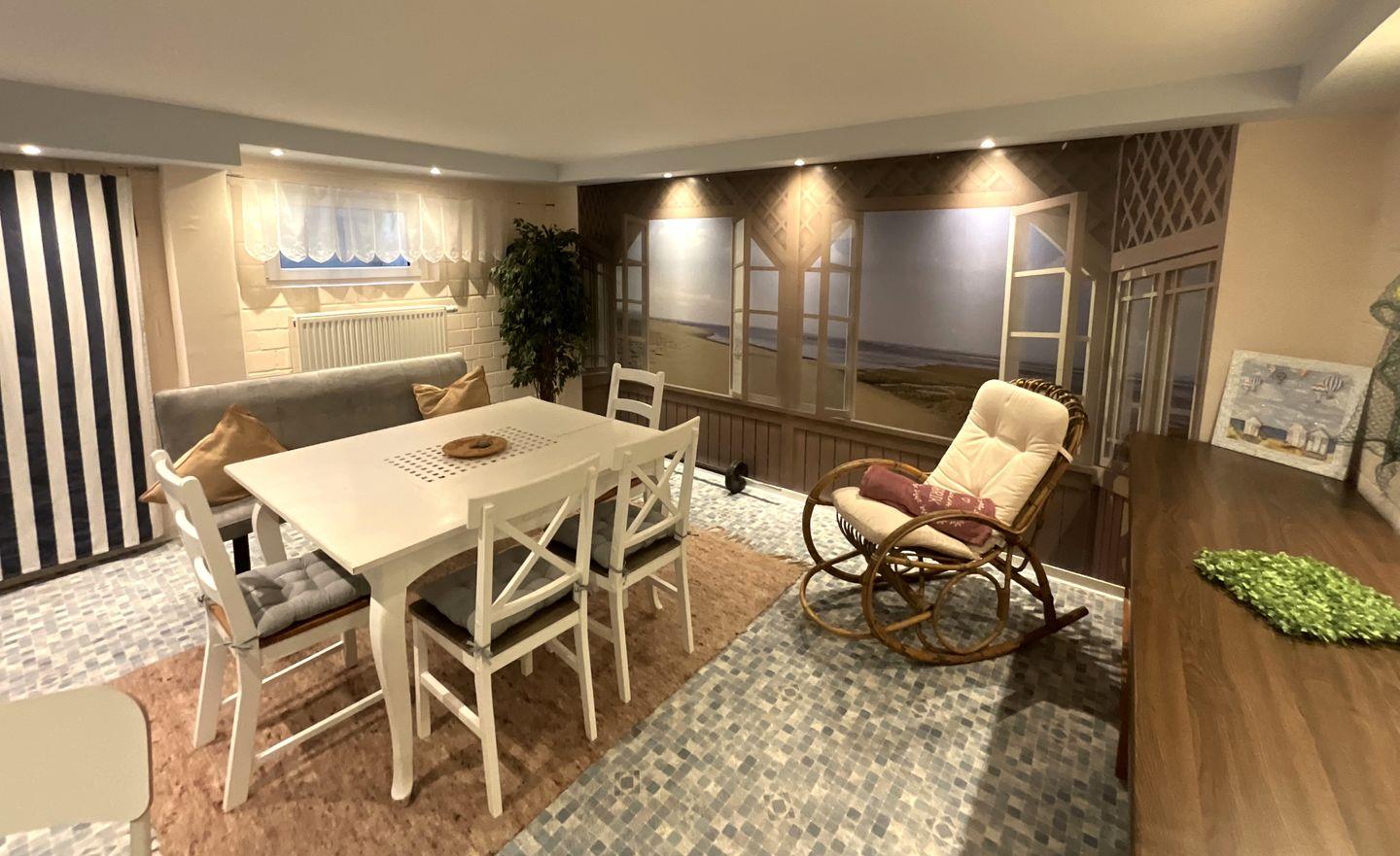 Die Ferienwohnung Friesenblau EG in Dangast bietet viel Platz, Sauna, Fitnessraum und einen eingezäunten Garten für erholsame Urlaubstage.