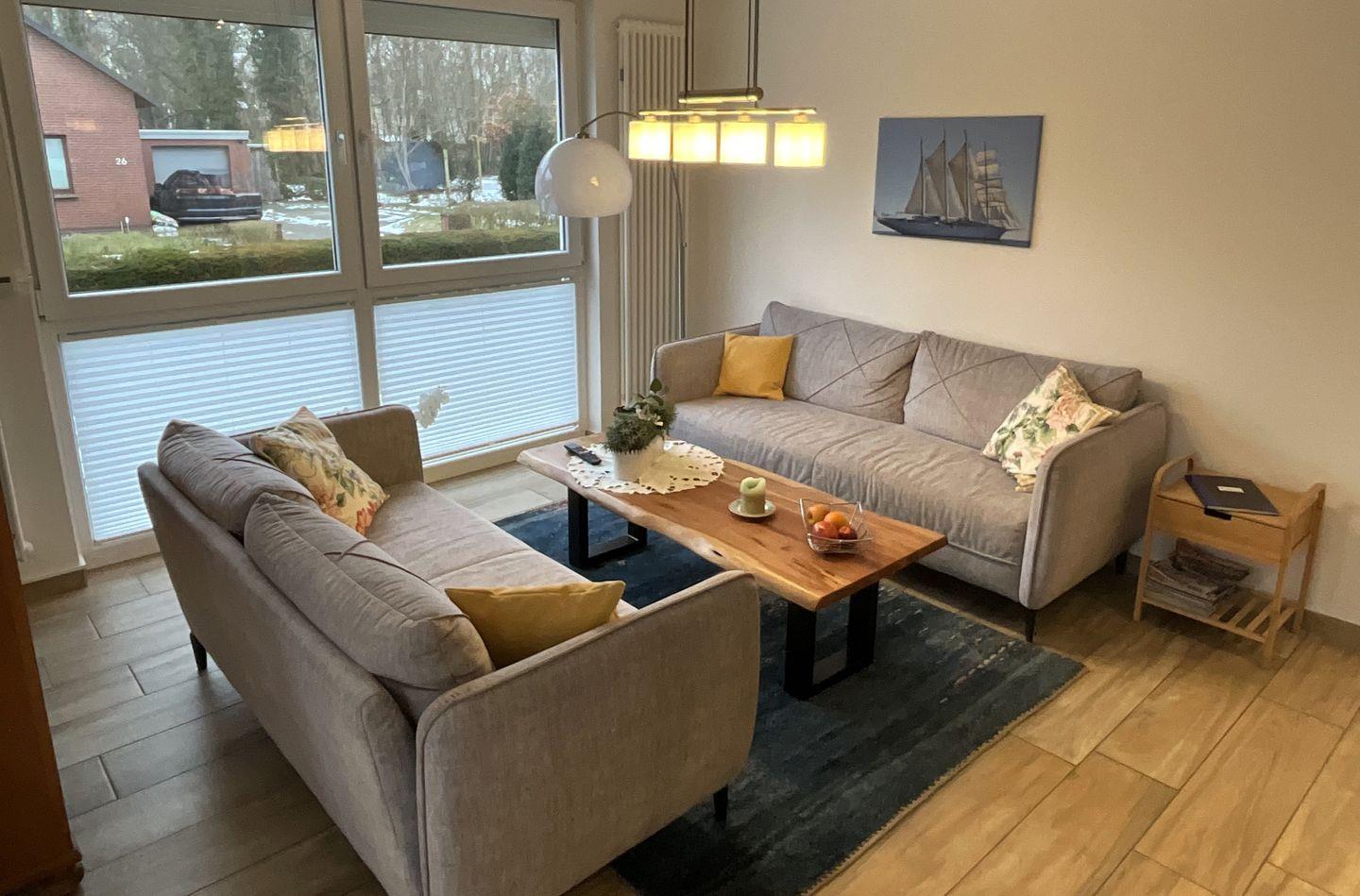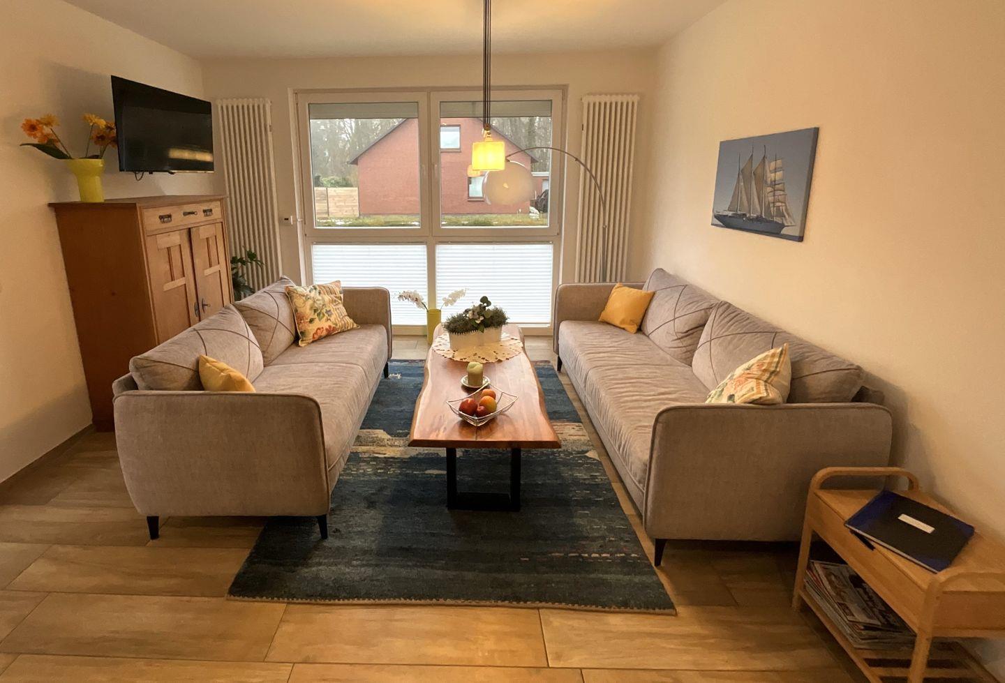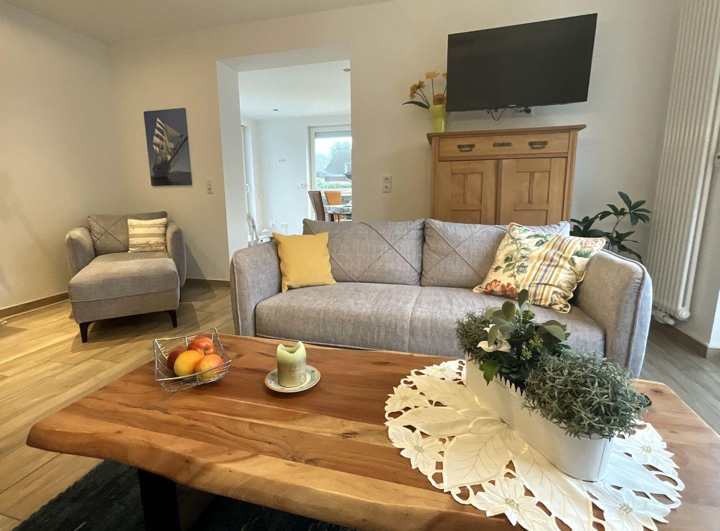 Im Inneren erwartet Sie ein durchdachtes Wohnkonzept mit offenem Übergang zwischen Küche und Wohnzimmer. Der Wohnbereich ist mit einer Sofaecke, Sofa, Esstisch und TV (1) ausgestattet. Fliesenböden im Wohn- und Schlafbereich sind pflegeleicht und praktisch – besonders bei Strandtagen oder wenn Sie mit Ihrem Haustier anreisen: Haustiere sind erlaubt, maximal 1 Tier. Selbstverständlich ist die Ferienwohnung ein Nichtraucherobjekt.