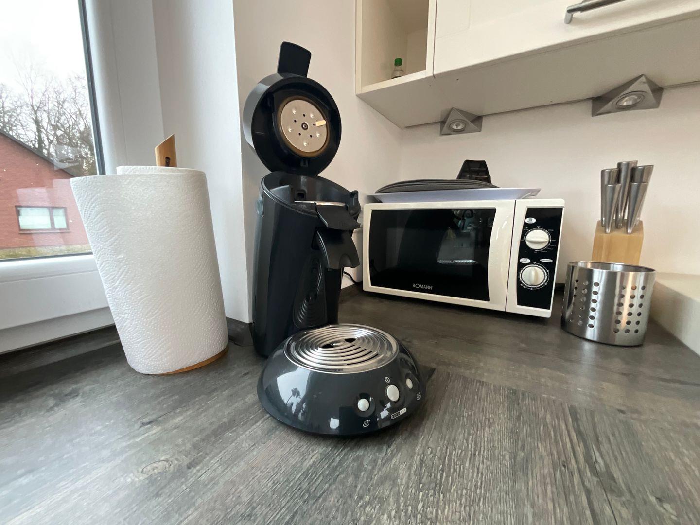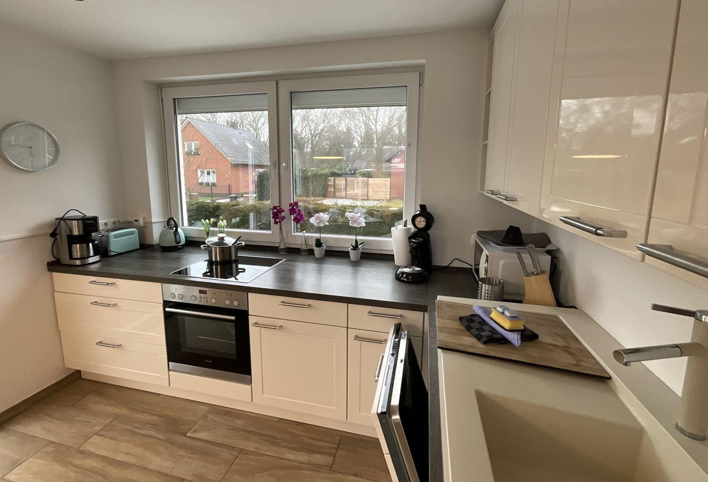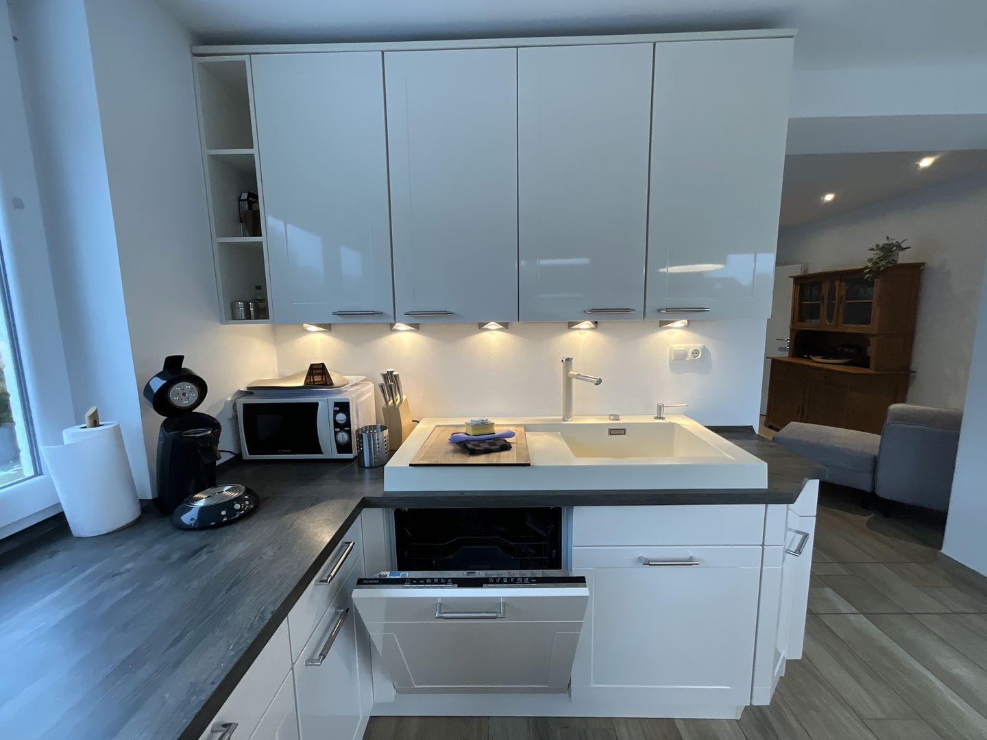 Die Küche ist vollständig eingerichtet und bietet alles, was Sie für die tägliche Selbstversorgung benötigen: Ceran-Herd, Backofen (elektrisch), Mikrowelle, Spülmaschine, Kühlschrank mit Gefrierfach, Kaffeemaschine, Senseo-Espressomaschine, Wasserkocher, Toaster sowie Küchenutensilien, Geschirr und Besteck.