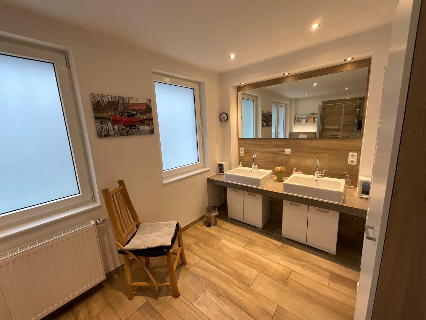 Bad und Sanitär: bodentiefe, barrierefreie Sommerregendusche, Waschtischanlage mit Spiegel, Föhn, WC, Handtuchheizung, Handtücher auf Anfrage