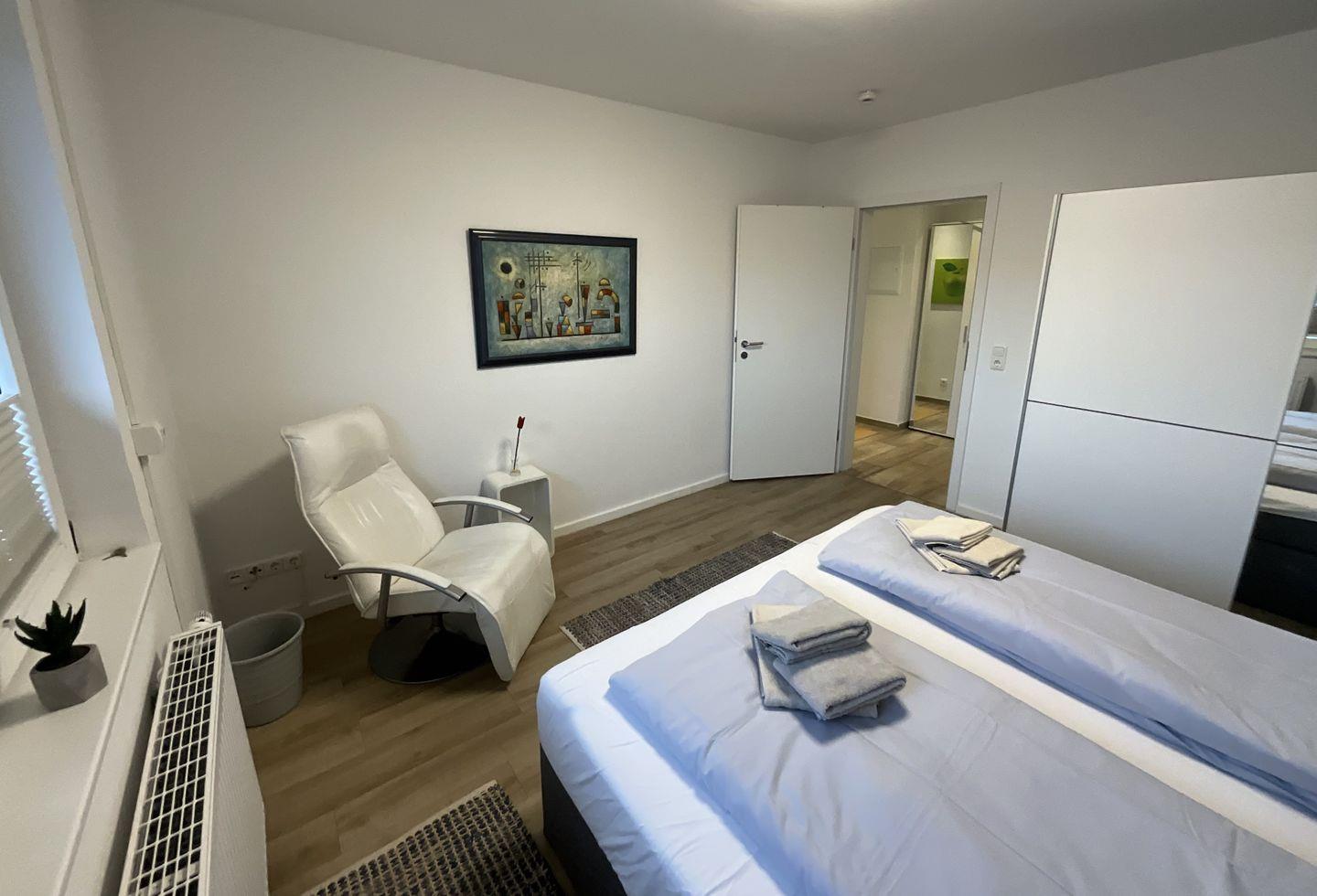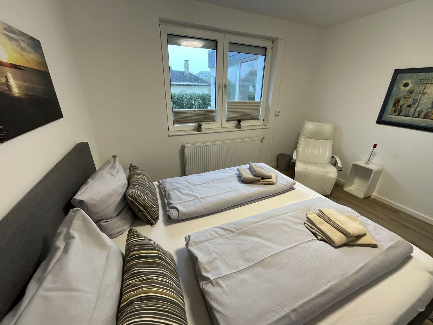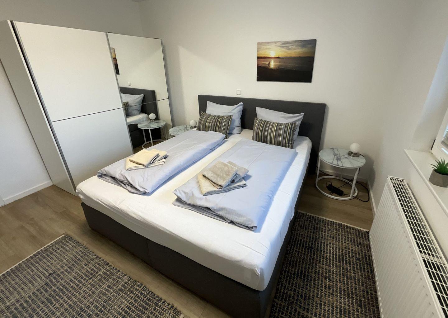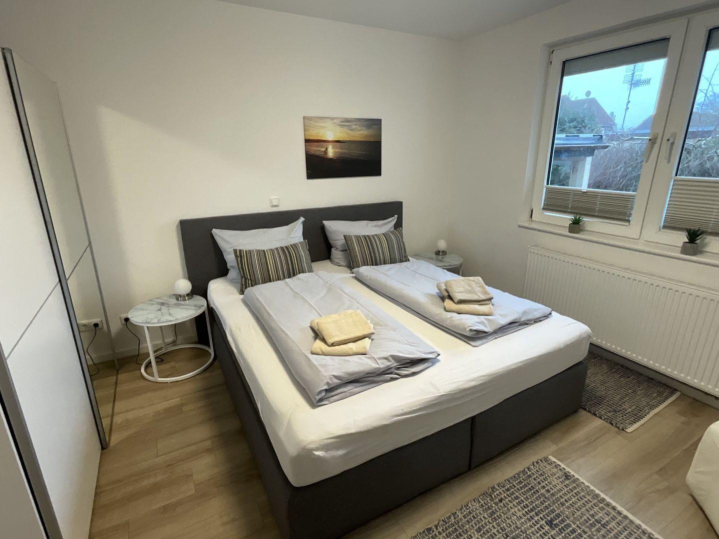 Schlafzimmer 1: Doppelbett (Maße: 180 x 200 cm) mit 1 durchgängigen Matratze, Leselampen, Kleiderschrank, Rolläden, Bettwäsche auf Anfrage