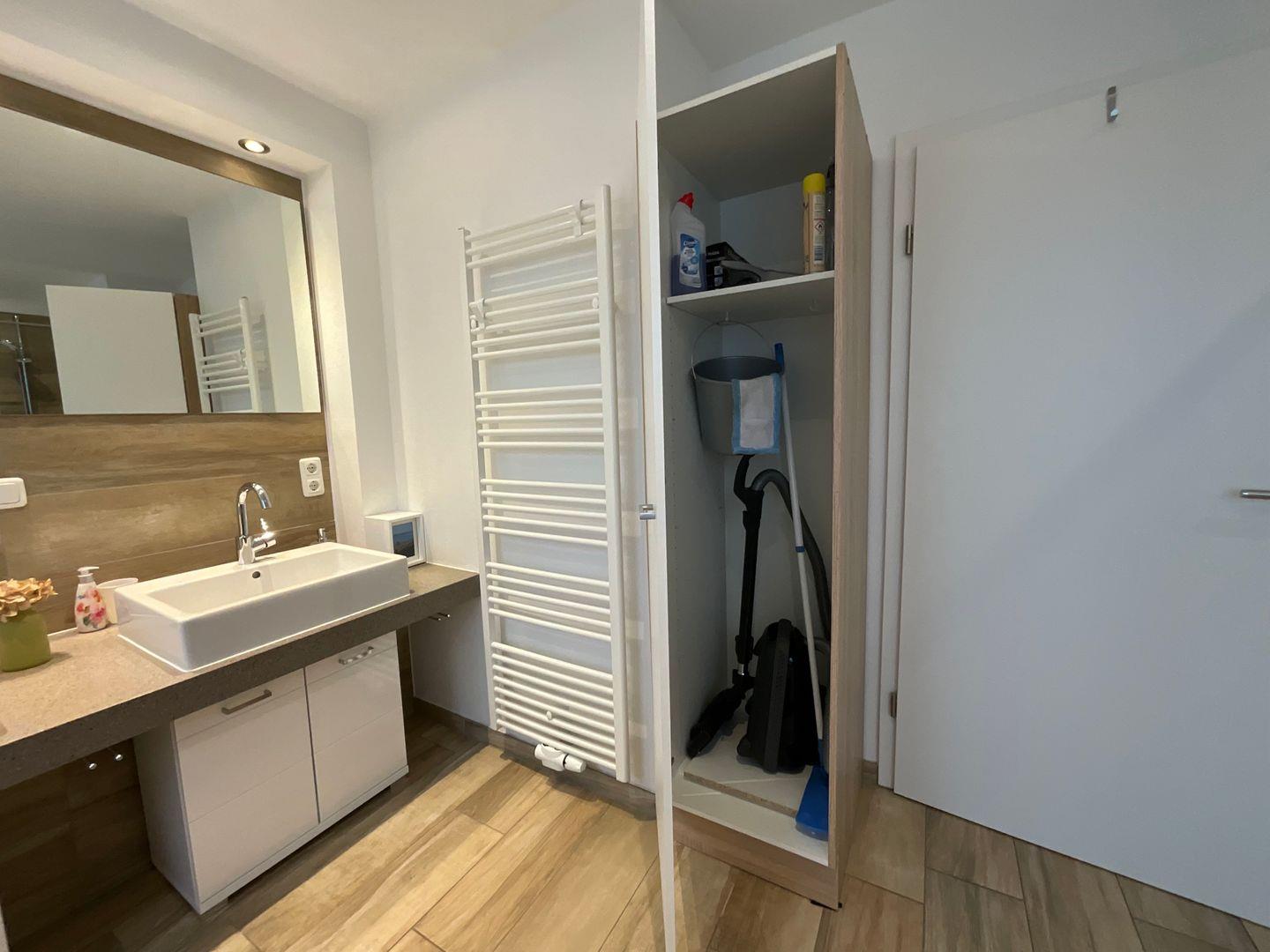 Abstellraum: Waschmaschine + Trockner im Keller, Wischer, Eimer, Handfeger, Staubsauger, Wäscheständer