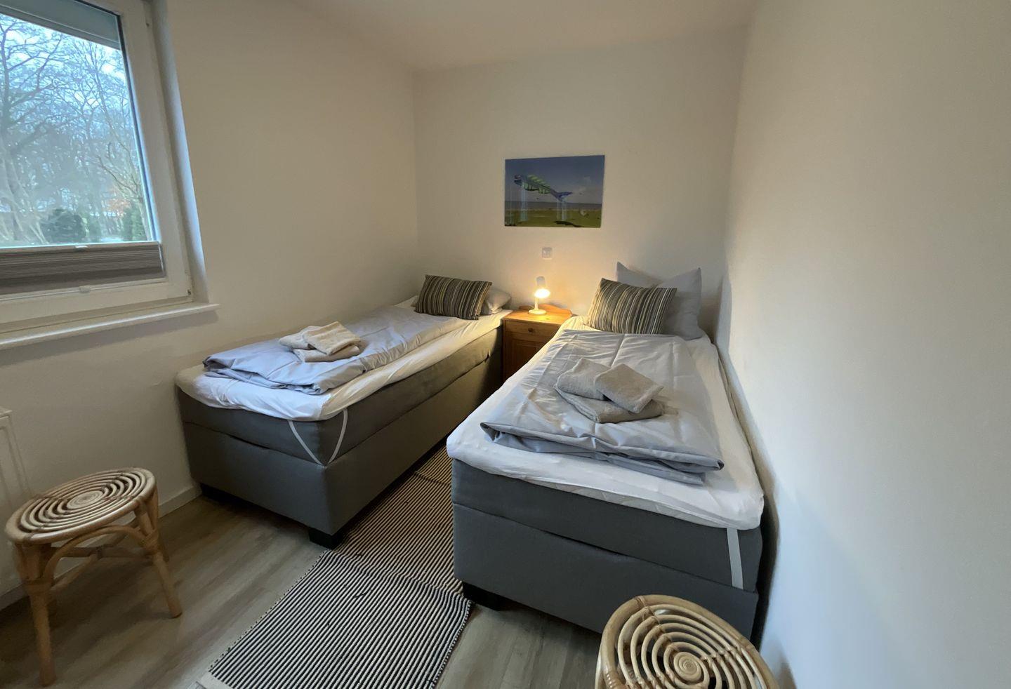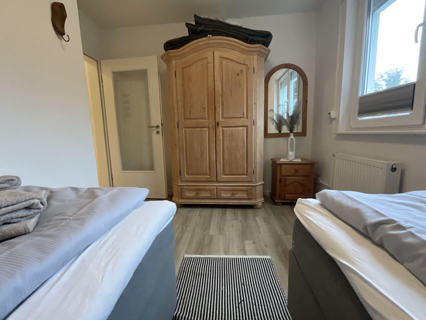 Schlafzimmer 2: 2 Einzelbetten (Maße: 90 x 200 cm), Leselampe, Kleiderschrank, Rolläden, Bettwäsche auf Anfrage