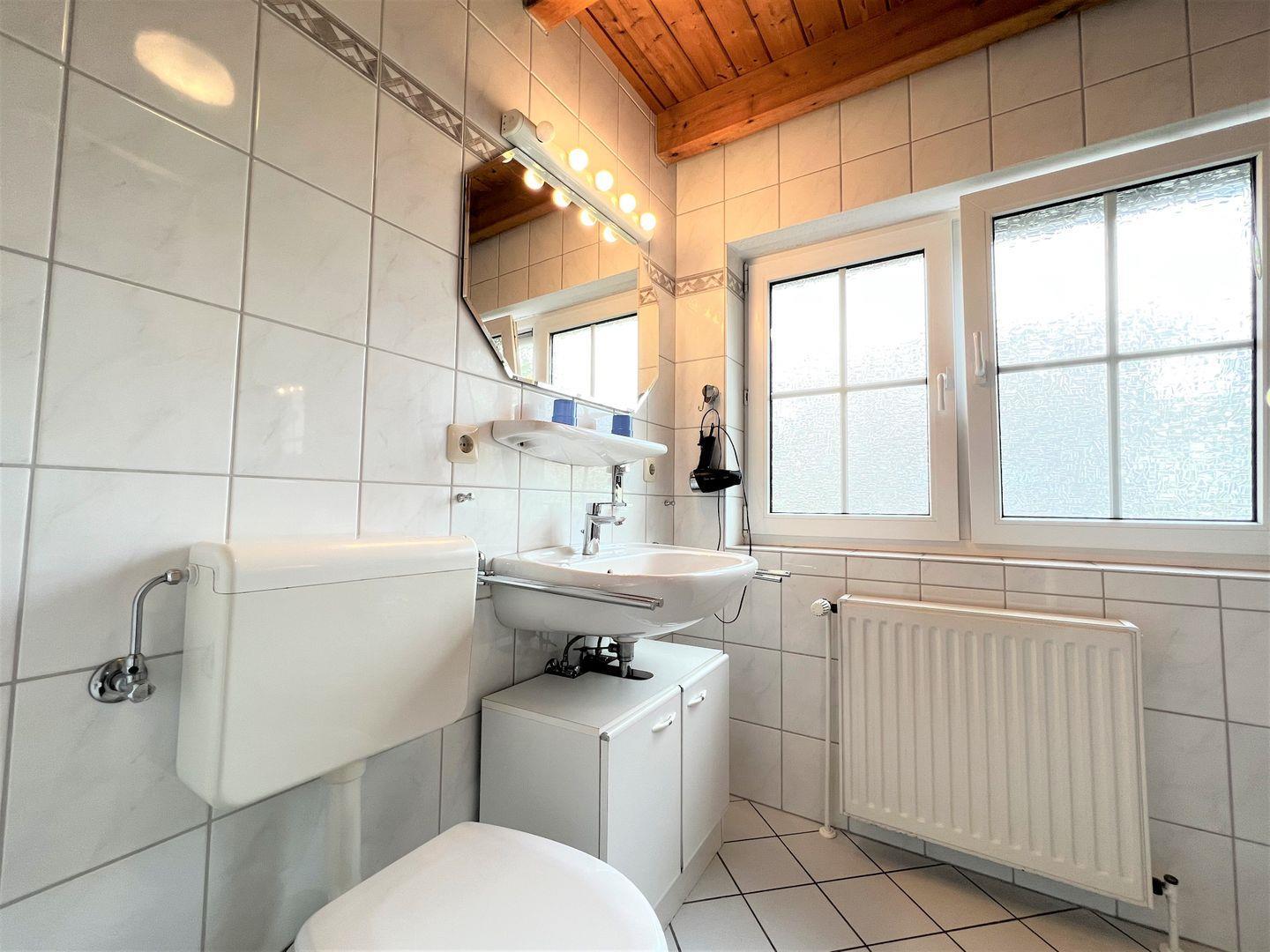 Das Duschbad liegt in der Mitte mit Waschmaschine und Tageslicht.