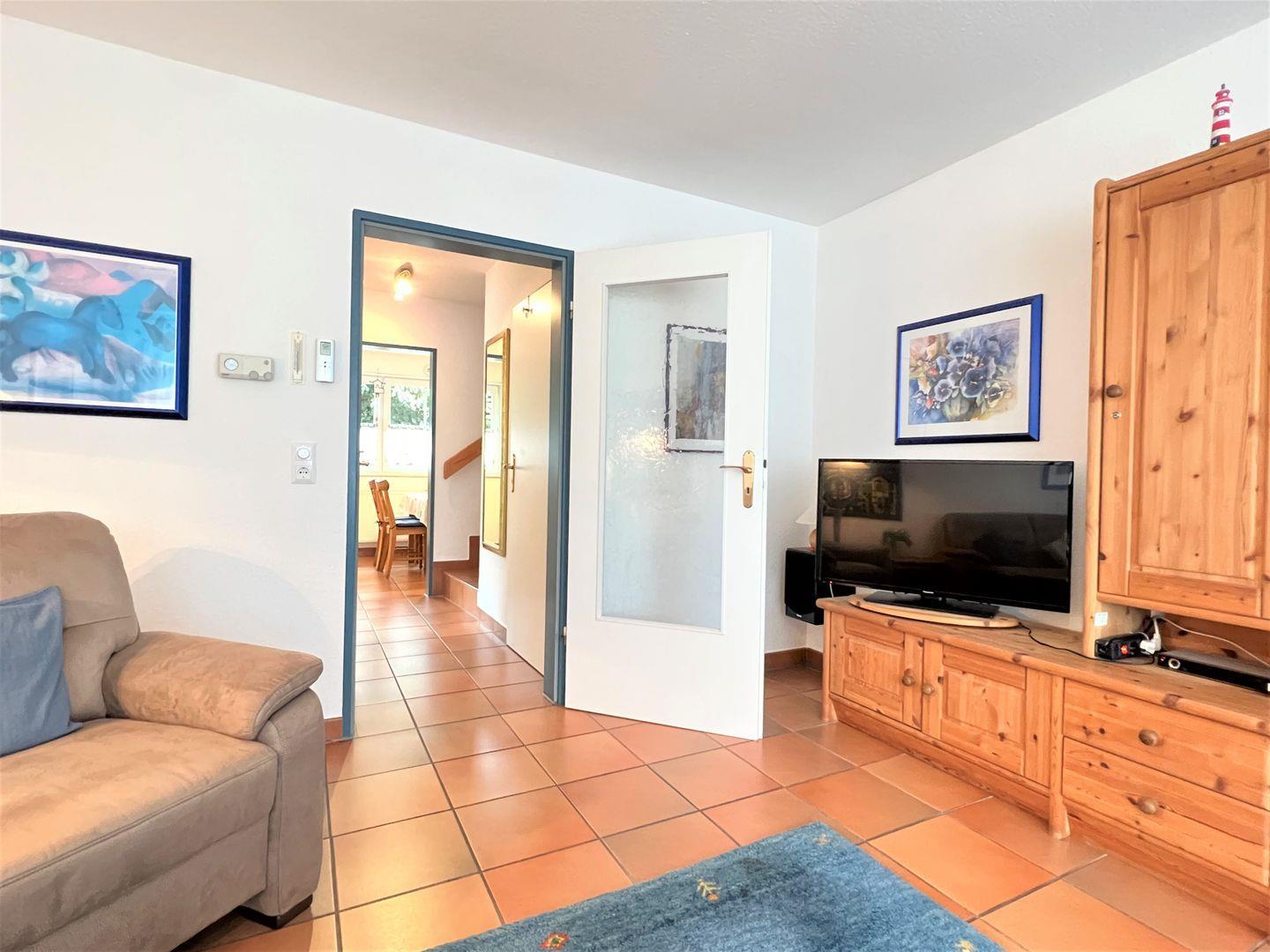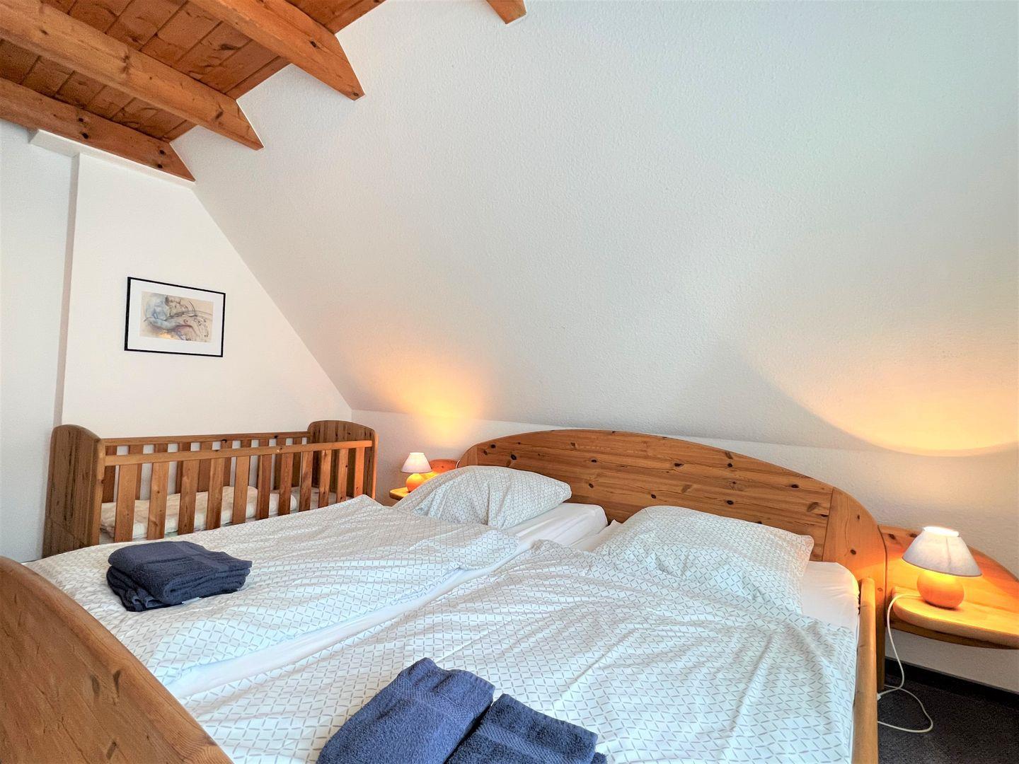 Im Erdgeschoss befindet sich die freundliche Wohnküche mit Vollausstattung und der separate Wohnbereich mit Zugang zur Terrasse. Zusätzlich steht Ihnen ein Gäste-WC und die Garderobe zur Verfügung. Im Obergeschoss sind zwei Schlafzimmer vorhanden: das Elternschlafzimmer mit Ehebett sowie ein weiteres mit zwei Einzelbetten plus einem Kinderholzstäbchenbett.
