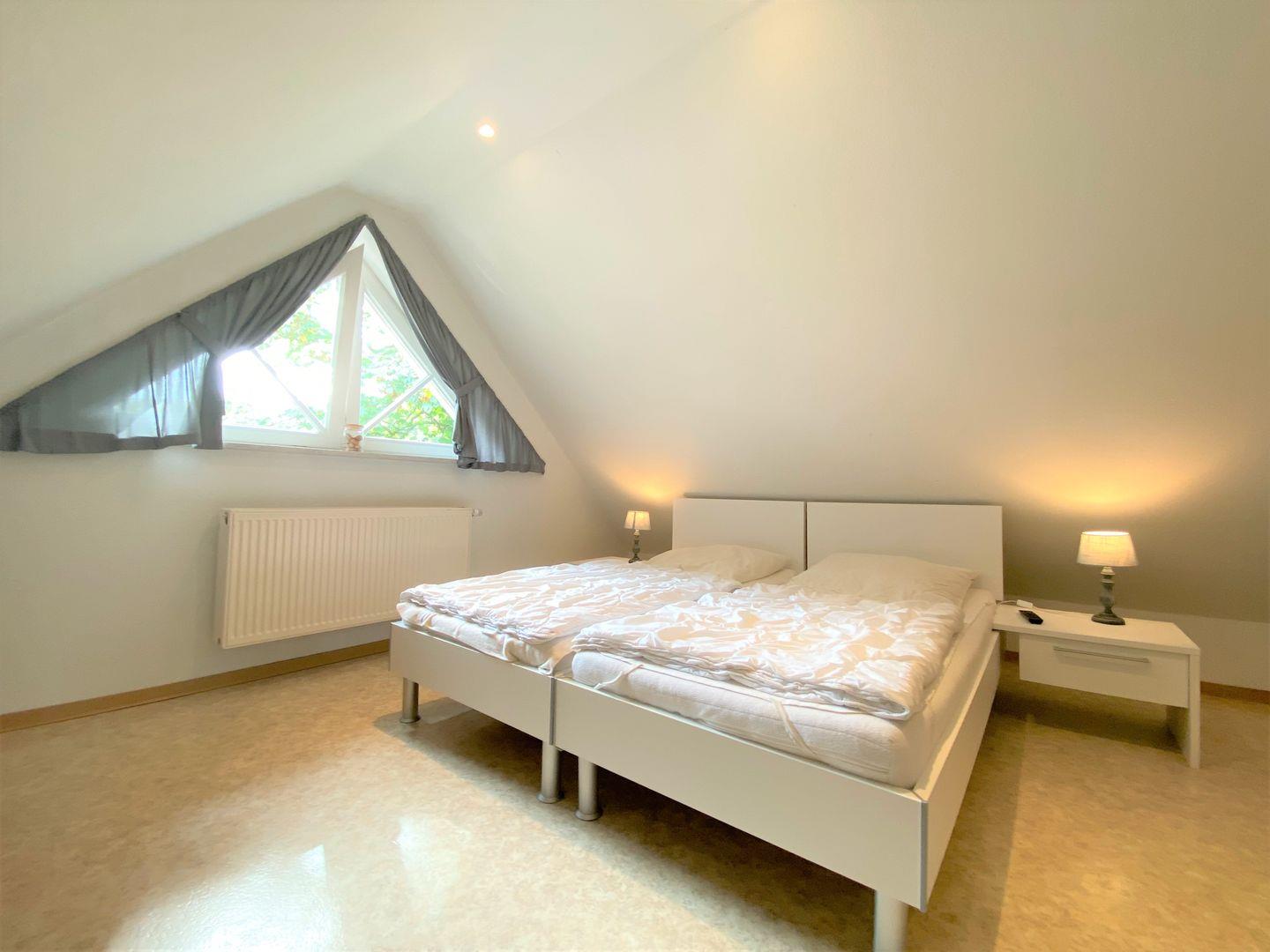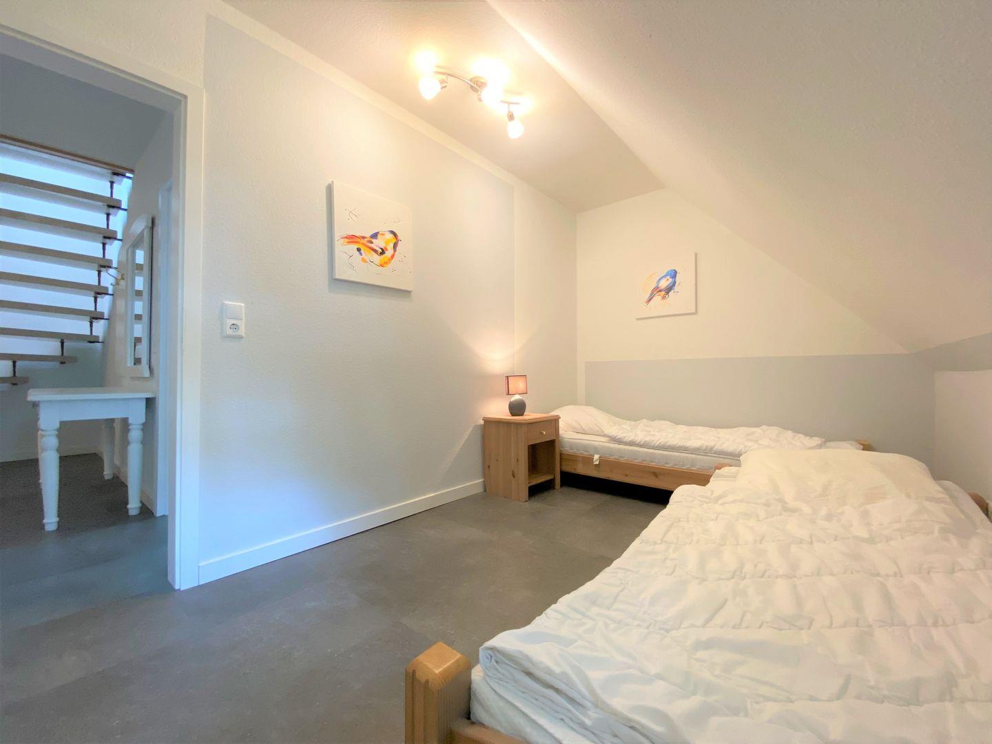 Sie verfügen über drei Schlafzimmer: Das Elternschlafzimmer mit Ehebett und ein Kinderschlafzimmer mit zwei Einzelbetten im ersten Geschoss, sowie das dritte Schlafzimmer mit zwei Einzelbetten im ausgebauten Dachstudio.