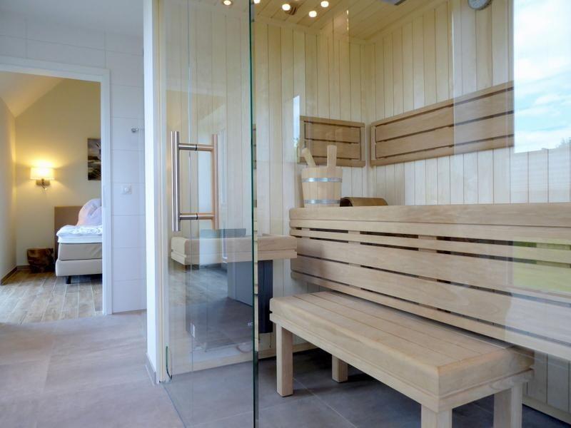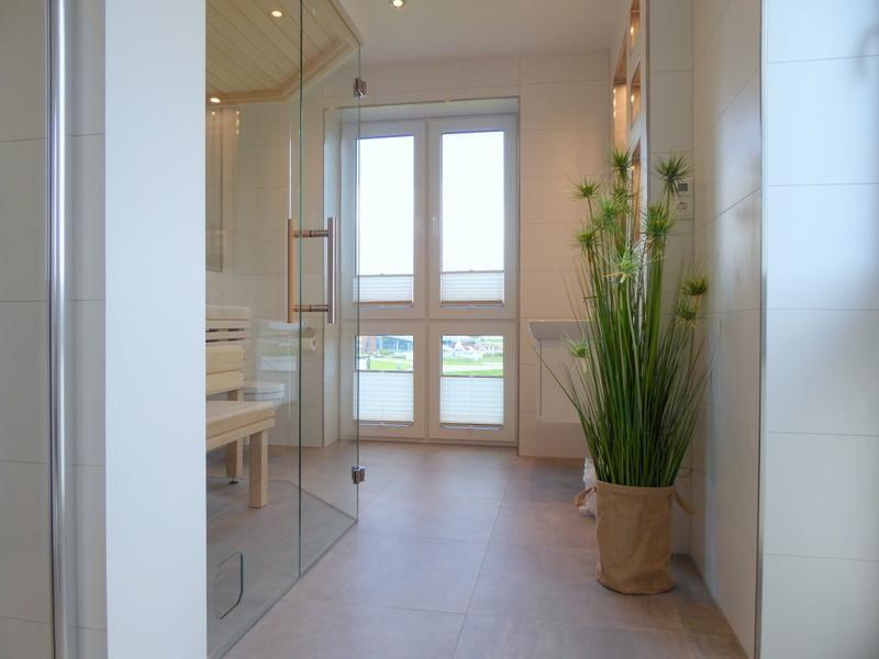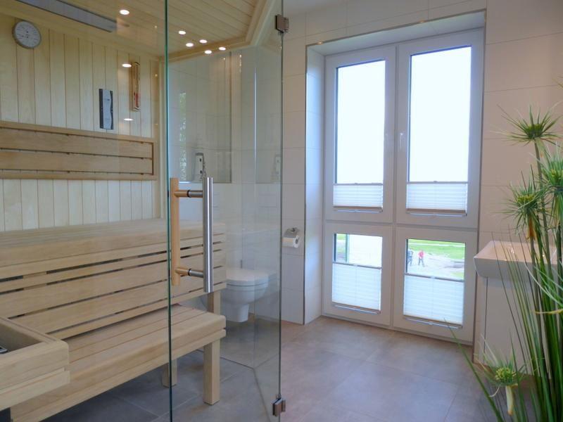 Tagelichtbad: 1 exklusives Tageslichtbad mit moderner Sauna mit LED Technik Sound & Light und direkten Blick auf das Wattenmeer, bodengleiche Walk-In-Sommerregendusche, großer Spiegel, Handtuchwärmer, Fußbodenheizung, Kosmetikspiegel, integrierte Radioanlage und Föhn