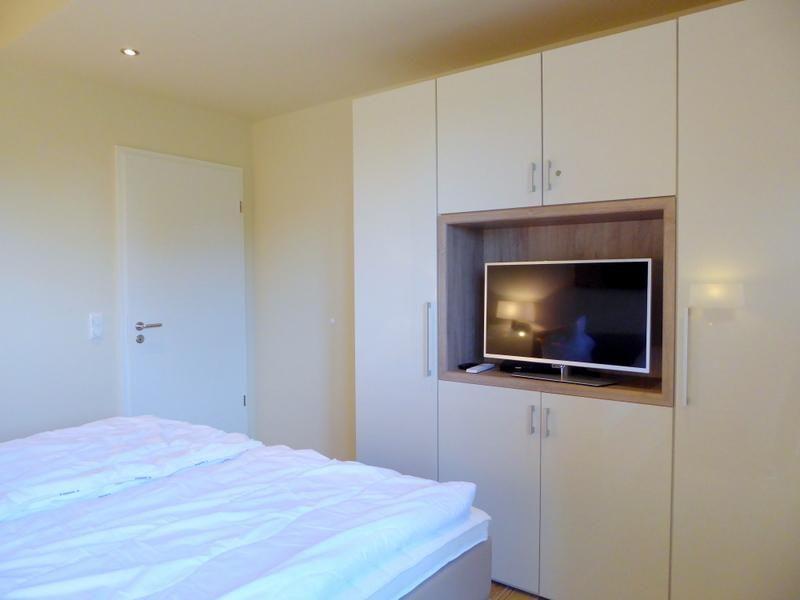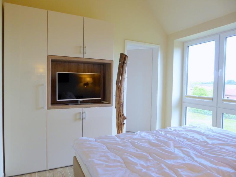 Schlafzimmer: 2 gemütlich eingerichtete Schlafzimmer mit rückenschonenden Boxspringbetten (Komforthöhe, Maß: 180 x 200 cm), Flatscreen-TV, 1 x DVD-Player, Leselampen, Kleiderschrank, Ganzkörperspiegel, Fußbodenheizung und beschichteten Plissees zur Verdunkelung, ein Schlafzimmer mit Meerblick