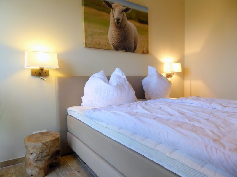 Beim Gang in das zweite Schlafzimmer mit gleicher Ausstattung geht es über zum Highlight: Das traumhafte Tageslichtbad mit großer, bodengleicher Walk-In-Sommerregendusche, integrierter Radioanlage und moderner Sauna mit innovativer LED Technik Sound & Light. Während eines wohltuenden Saunabades können Sie direkt aus der gläsernen Sauna ihren Blick auf die Nordsee schweifen lassen. Mee(h)r Entspannung geht nicht!