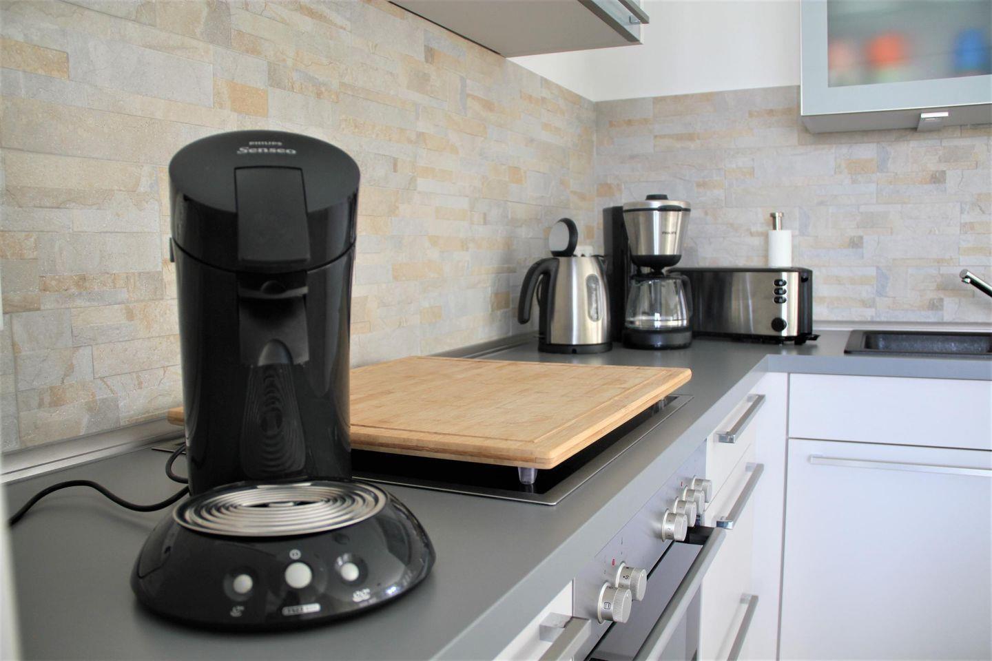 Küche und Haushalt: Vollausgestattete Küche mit E-Herd, Ceranfeld, Kühlschrank mit Tiefkühlfach, Filterkaffee- und Kaffeepadmaschine, Wasserkocher, Esstisch drinnen und draußen, Mikrowelle