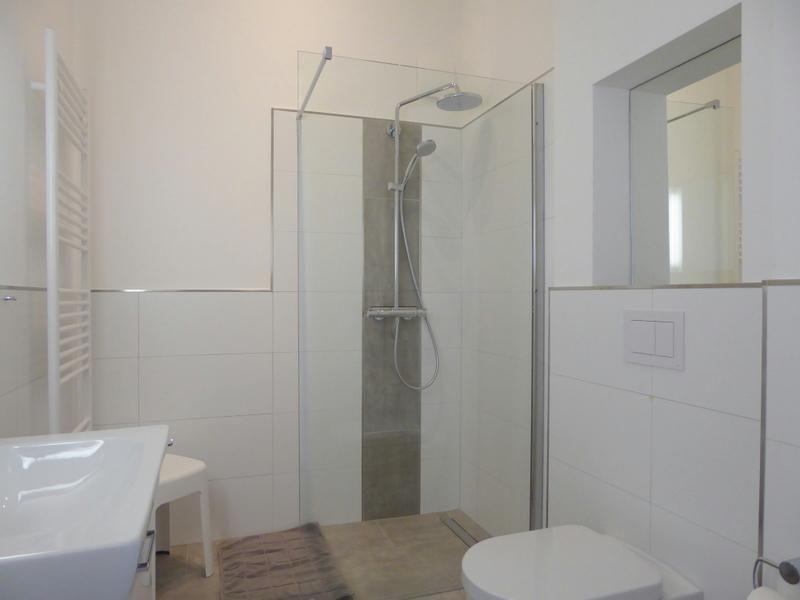 Duschbad: 1 elegantes Duschbad mit bodengleicher Walk-In-Sommerregendusche, Fußbodenheizung, Handtucherwärmer und WC