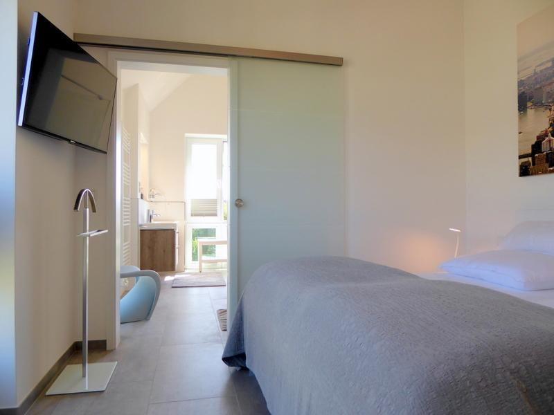 Über einen Fahrstuhl oder die Treppe gelangen Sie in Ihr Premiumdomizil. Gleich links geht es schon in das erste Schlafzimmer mit großem Doppelbett plus großem Kleiderschrank. Ein Flat-TV an der Wand rundet das Angebot ab. Die Fenster sind mithilfe abdunkelnder Plissees schnell und einfach zu verdunkeln.