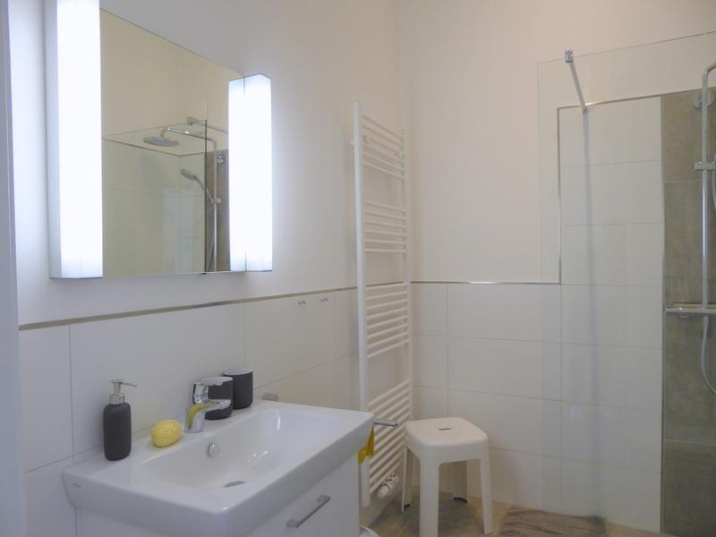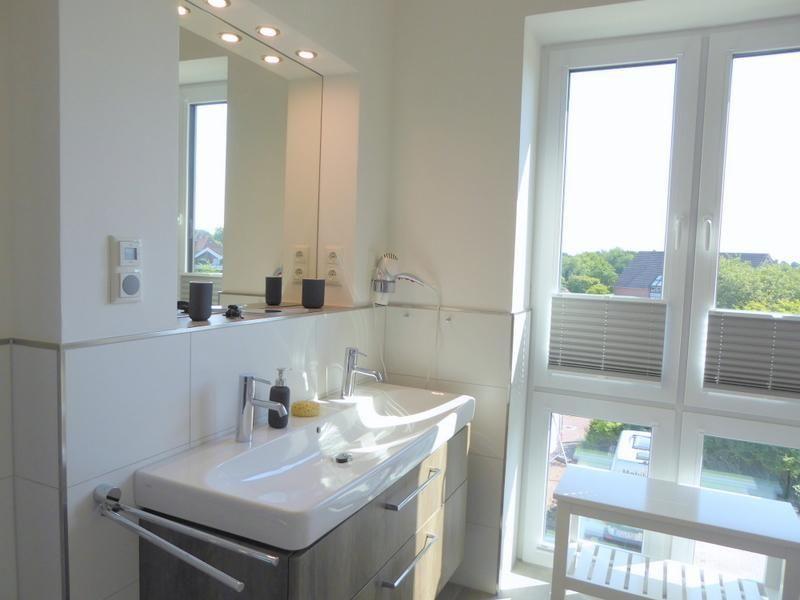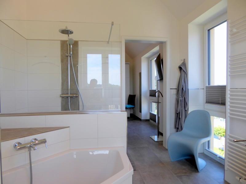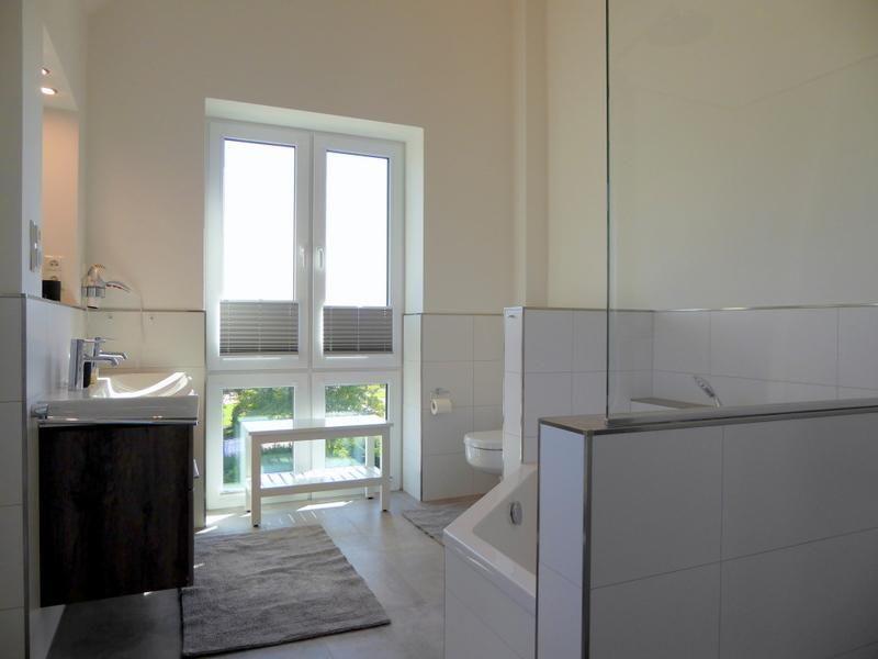 Tageslichtbad: 1 exklusives Tageslichtbad mit Waschtisch und beleuchtetem Spiegel, bodengleiche Walk-In-Sommerregendusche, Eckbadewanne, großer Spiegel, Handtucherwärmer, Fußbodenheizung