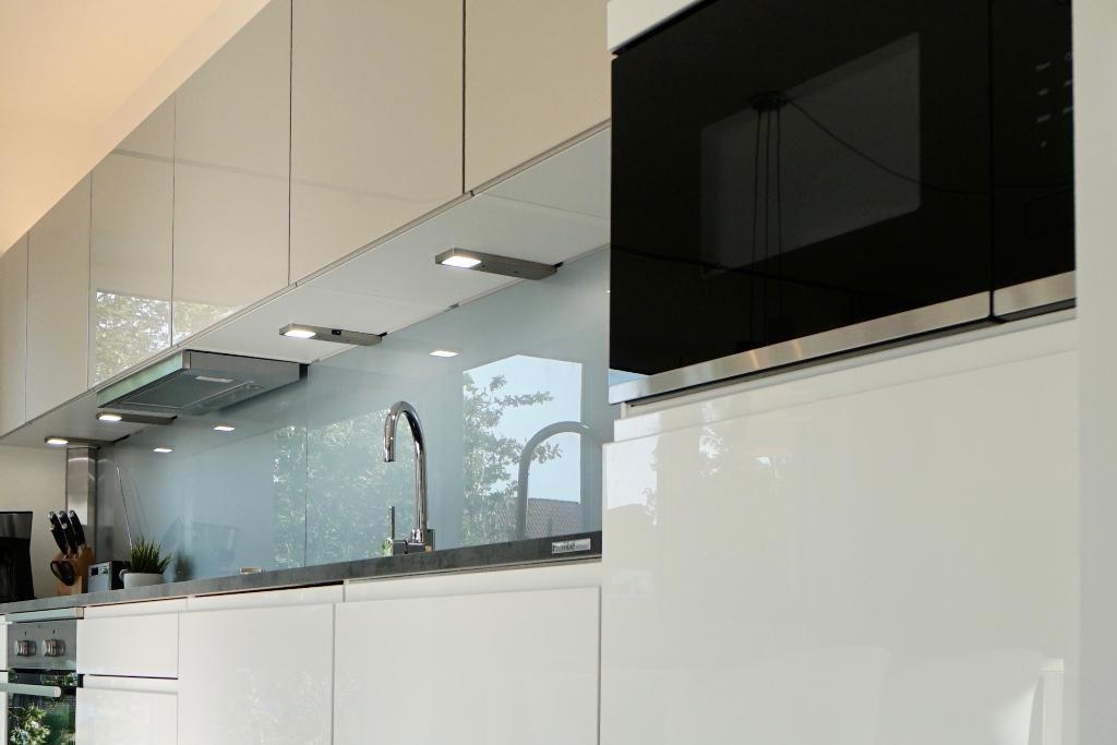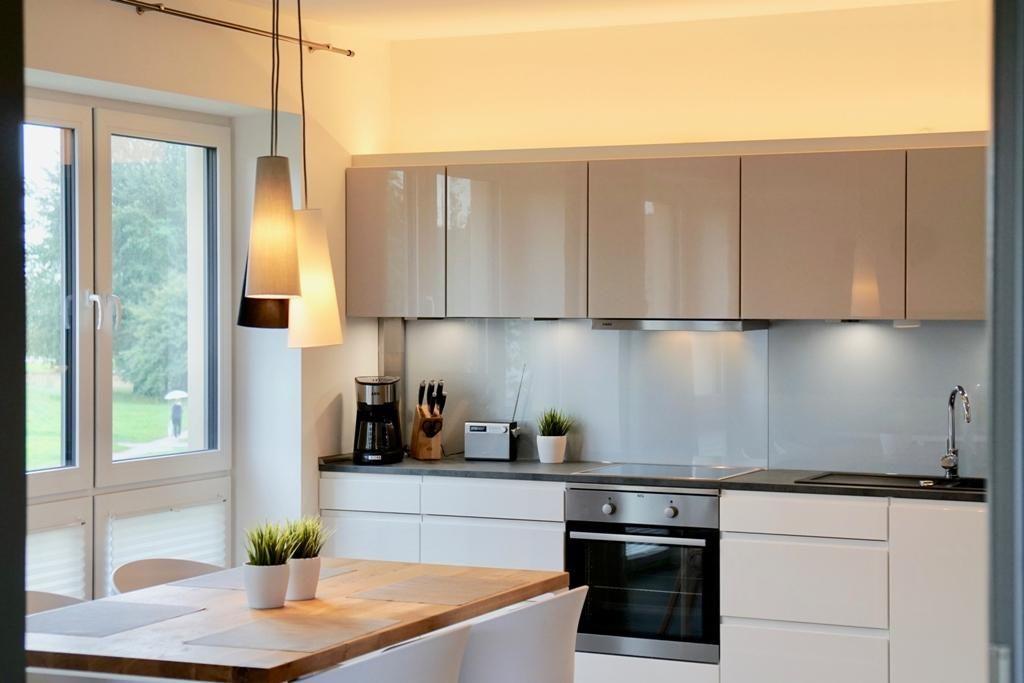 Küche und Haushalt: Einbauküche, Kühlschrank mit Gefrierfach, 4-Zonen Cerankochfeld, Backofen, Dunstabzugshaube, Geschirrspüler, Kaffeemaschine, Toaster, Wasserkocher, hochwertiges Geschirr und Besteck, Mikrowelle