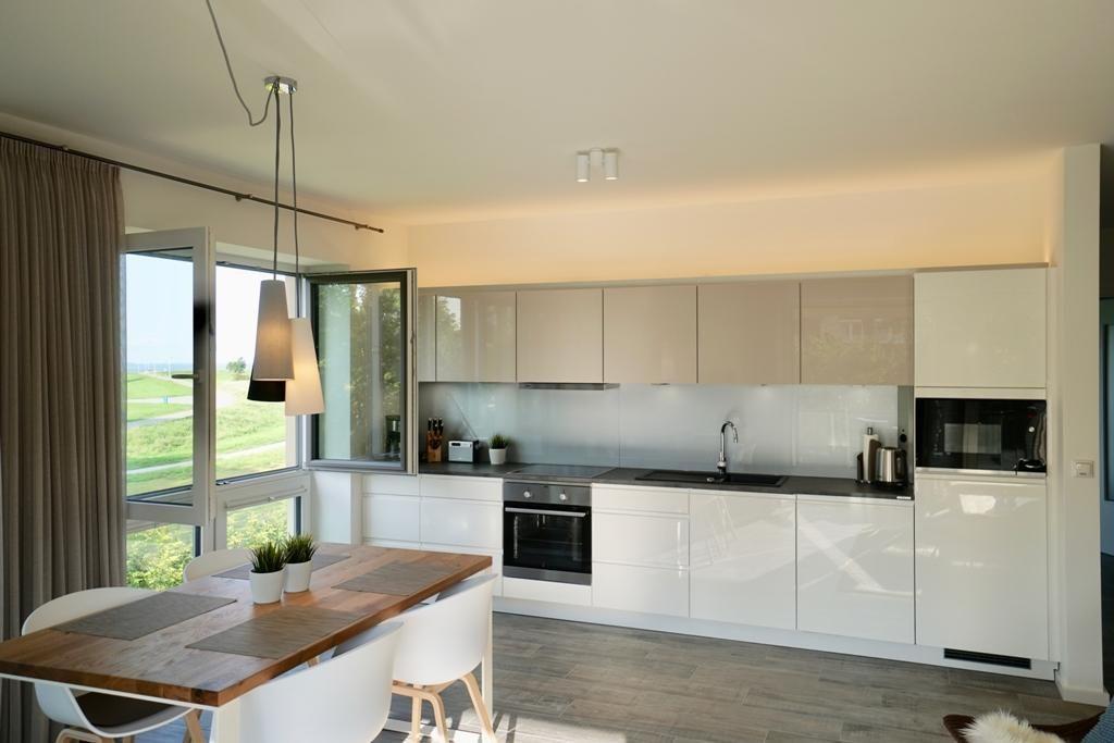 Am Abstellraum mit diversen Haushaltsutensilien vorbei geht es in den großen, wunderschönen Wohn-Essbereich mit Zugang zur Loggia. Beim Speisen und Beisammensein können Sie den Blick auf den Deich mit dem Jadebusen genießen. Auf der bequemen Couch oder im Relaxsessel können Sie gemütlich verweilen. Ein großer Flat-TV und ein Retroradio in der Küche sorgen für ausreichend Unterhaltung. Die große, vollwertige Küche macht einen sehr hochwertigen Eindruck und lässt keinerlei Kochwünsche offen.