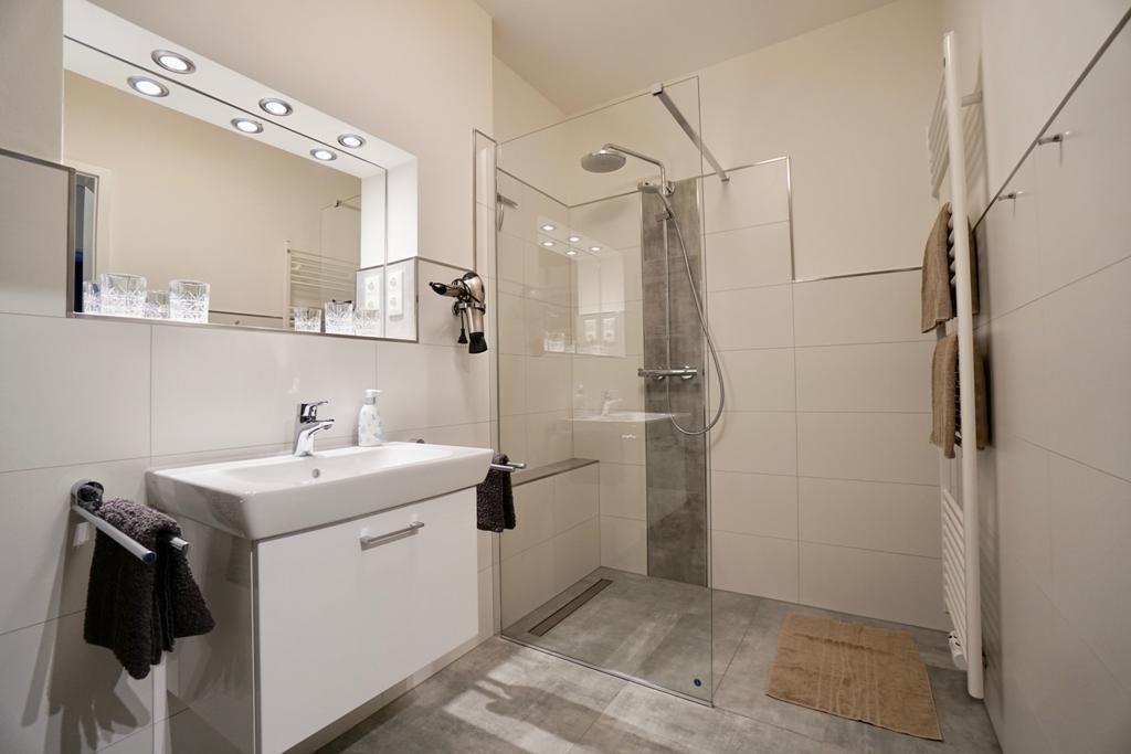 Bad und Sanitär: bodentiefe, barrierefreie Sommerregendusche, Waschtischanlage mit Spiegel, WC, Handtuchheizung, Handtücher auf Anfrage