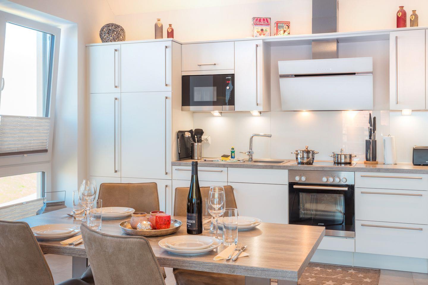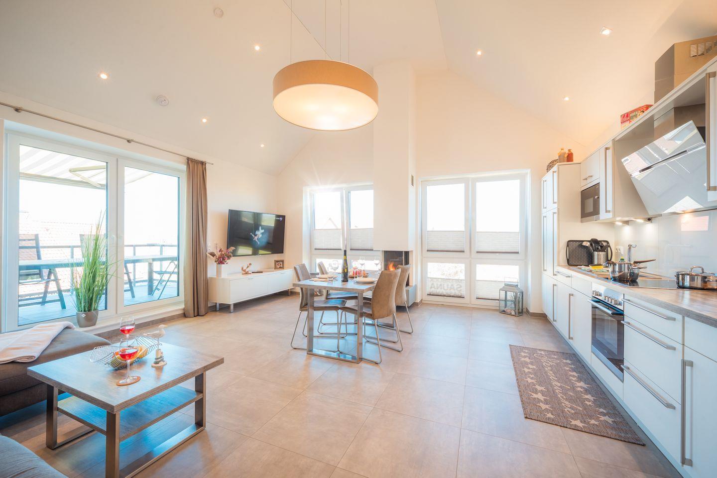 Der großzügige, lichtdurchflutete Wohnraum mit moderner Küchenzeile besticht auch bei ungemütlichem Wetter durch seinen Gaskamin mit wohliger Wärme auf Knopfdruck. Am zentralen Esstisch genießen Sie im Feuerschein vor dem Kamin Ihr Urlaubsmenü - oder spielen eines der Gesellschaftsspiele, die wir für Sie bereithalten. Oder Sie relaxen auf der Wohnlandschaft mit Ottomane vor dem eindrucksvollen 65 Zoll-4K-Flachbild-TV. Schnelles WLAN ist natürlich auch inklusive.