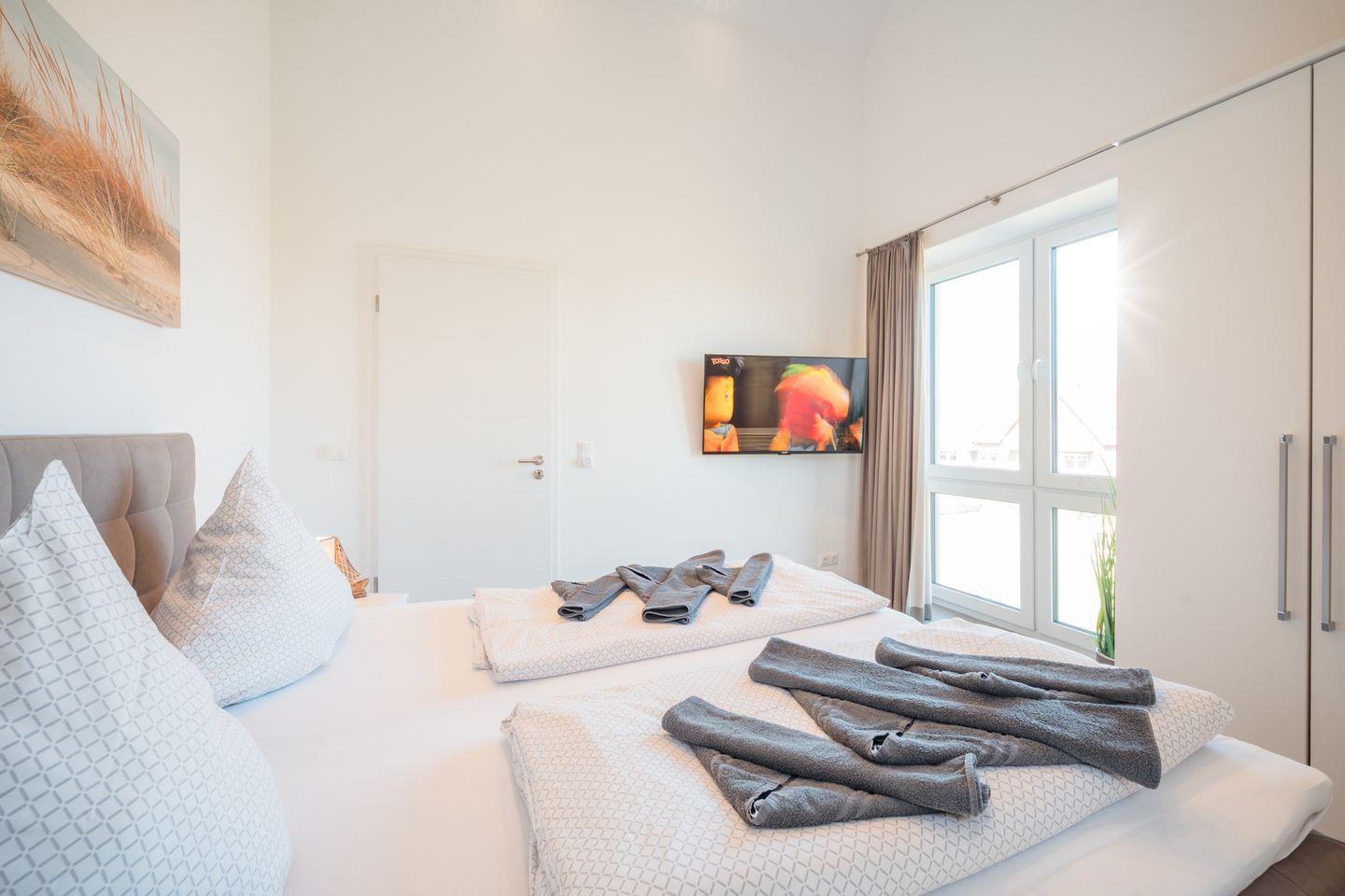 In dem Penthouse befinden sich zwei Schlafzimmer mit je einem Boxspring-Doppelbett (jeweils ein durchgehender Topper 180x200 cm). Extra hohe Komfortmatratzen mit zusätzlichen kuschelig-weichen Toppern sowie Fenster mit lärm- und wärmedämmender Dreifachverglasung sorgen für entspanntes Schlafen. Beide Schlafzimmer sind mit Full-HD-Flachbild-TV und Fliegengittern ausgestattet.