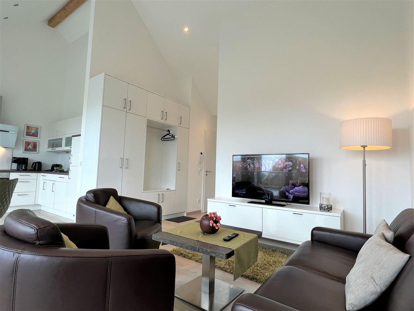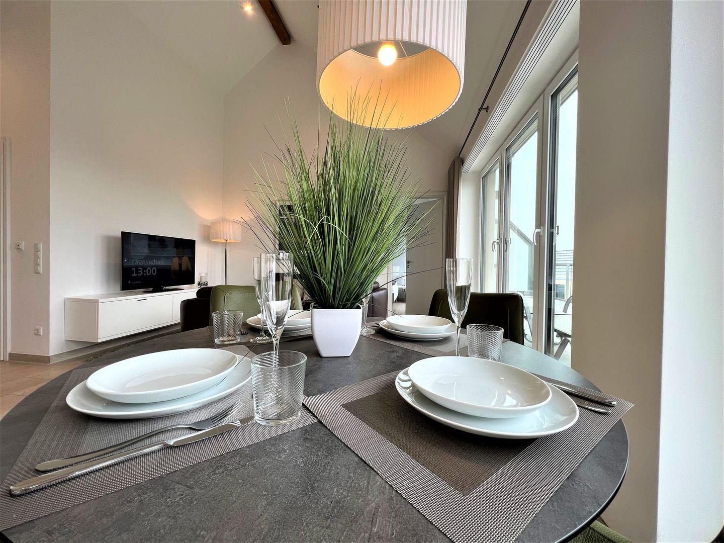 Vom Eingangsflur mit integrierter Garderobe geht es in den wunderschönen, offenen Wohn-Essbereich. Der Wohnbereich mit hochwertiger Ledergarnitur und großem Flat-TV lädt zum Entspannen und Relaxen ein. Der Essbereich mit rundem Esstisch, Lederstühlen und einer offenen, vollausgestatteten Küche besticht durch einen direkten Blick auf das Wattenmeer. Elegante und verstellbare Lamellen sorgen hier für Sichtschutz. Vom Wohn-Essbereich haben Sie einen direkten Zugang zum Highlight des Penthouses: Die riesige Dachterrasse mit Strandkorb und einem herrlichen Ausblick. Wie der Name "Sundowner" schon verrät, können Sie hier in den Abendstunden atemberaubende Sonnenuntergänge erleben und so Ihren erholsamen Urlaubstag ausklingen lassen. An sonnigen Tagen stehen Ihnen auch zwei bequeme Liegen (verstellbar) zur Verfügung. Eine große, elektrisch ausfahrbare Markise schützt Sie vor zu viel Sonne.