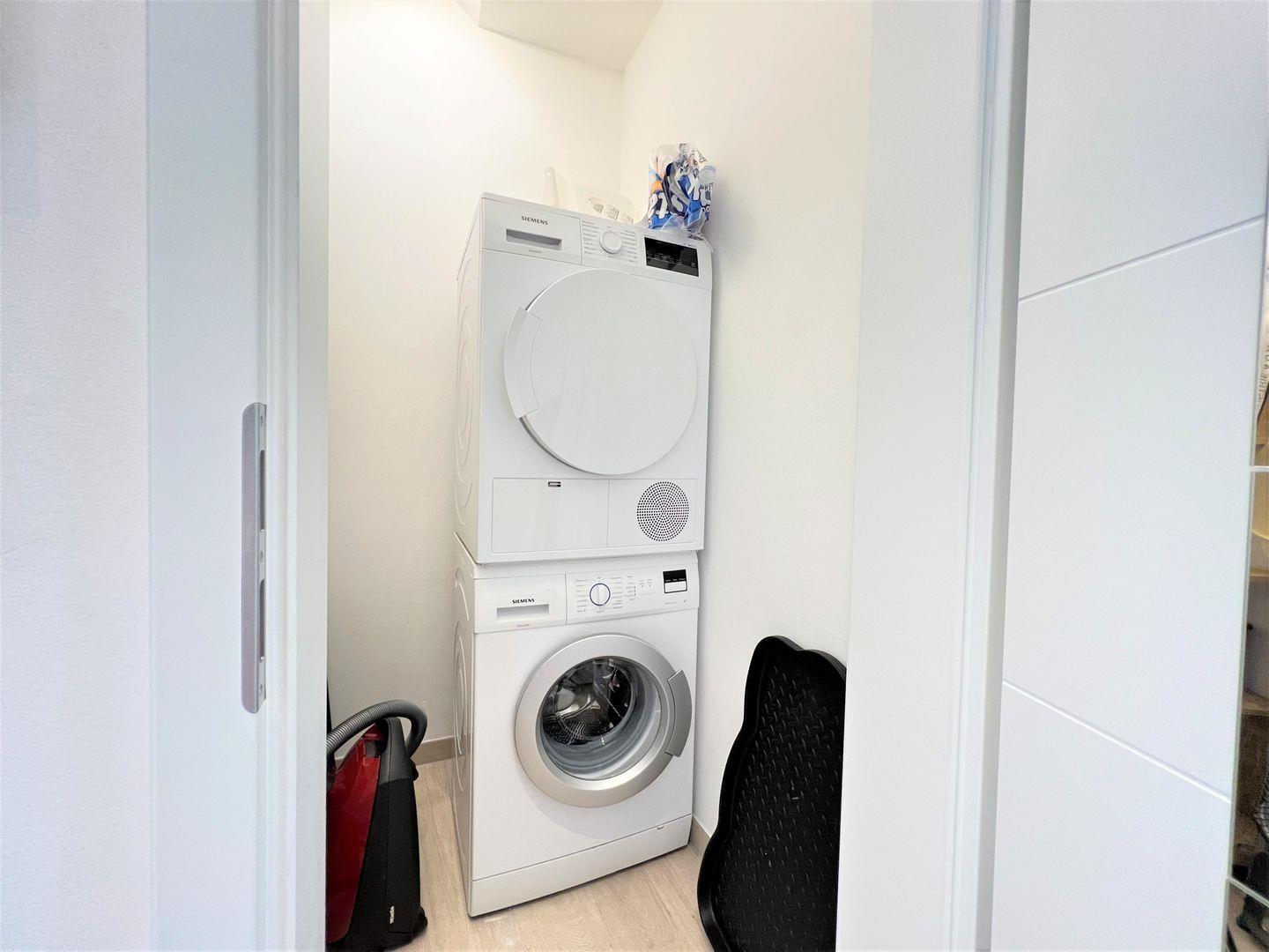 Abstellraum mit diversen Reinigungsutensilien: Waschmaschine und Trockner, Bügeleisen, Bügelbrett, Wischer, Eimer, Handfeger, Staubsauger, Wäscheständer