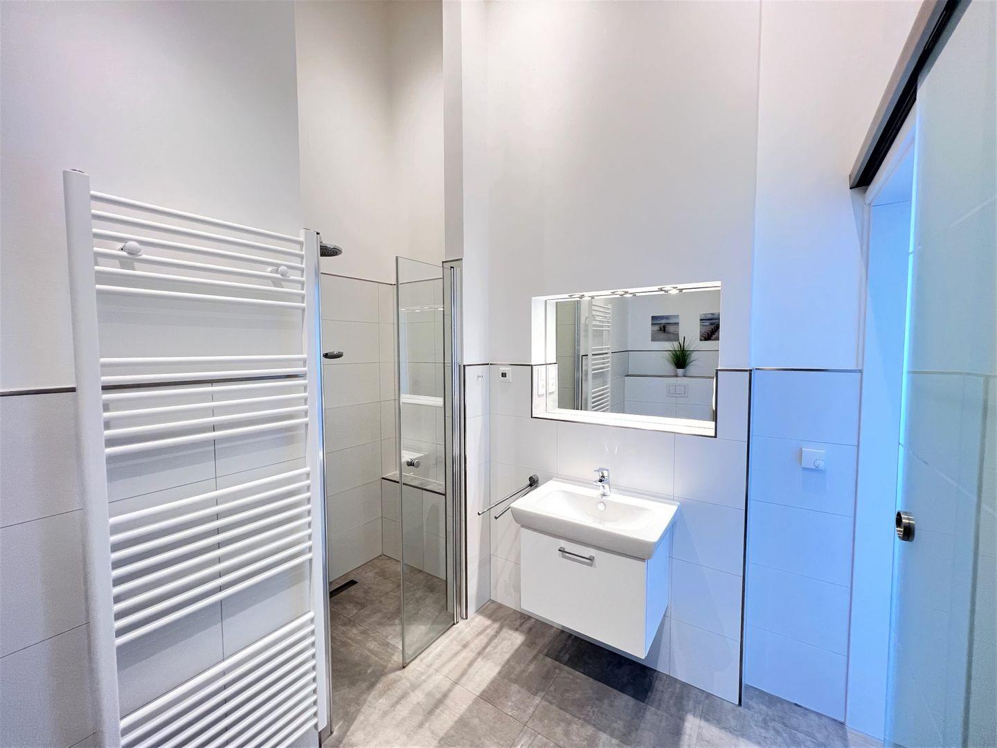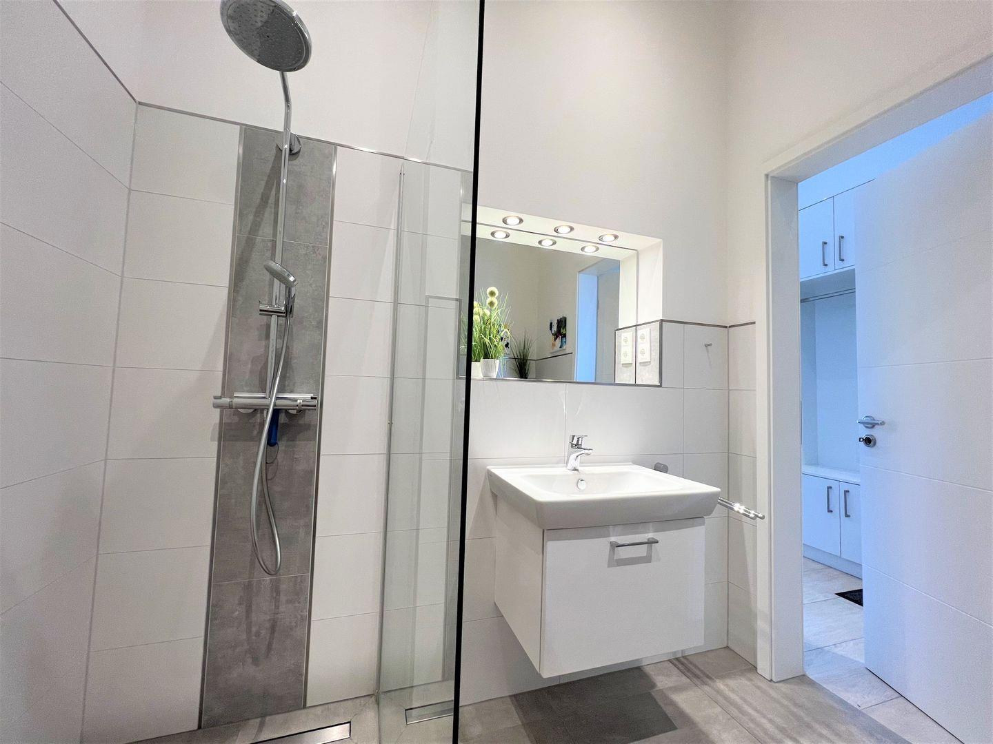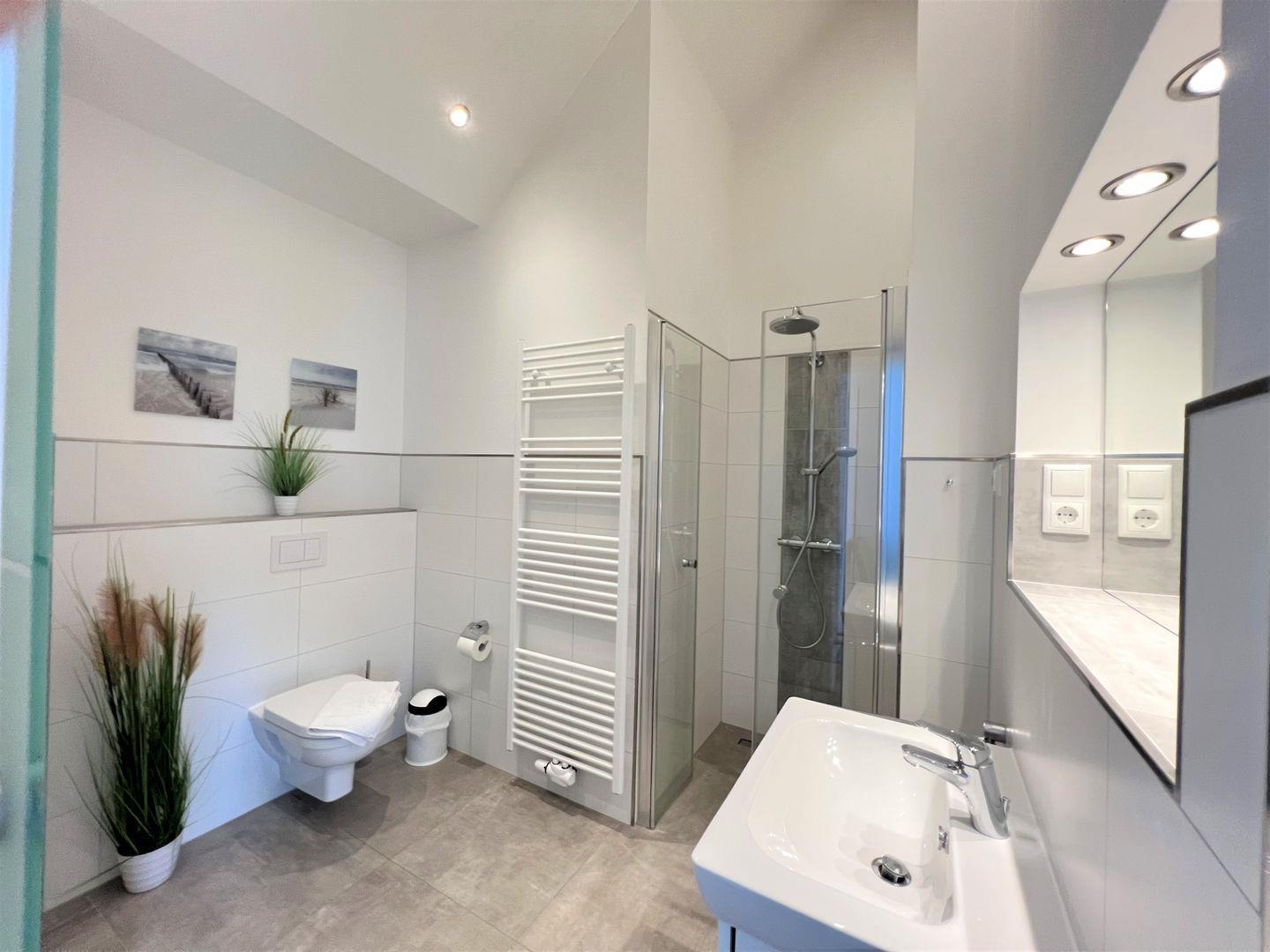 Über einen Fahrstuhl oder die Treppe gelangen Sie in Ihr Feriendomizil. Gleich links gehalten finden Sie das geräumige Duschbad mit begehbarer Sommerregendusche, Waschtisch und WC. Direkt gegenüber befindet sich der Abstellraum mit Waschmaschine und Trockner.
