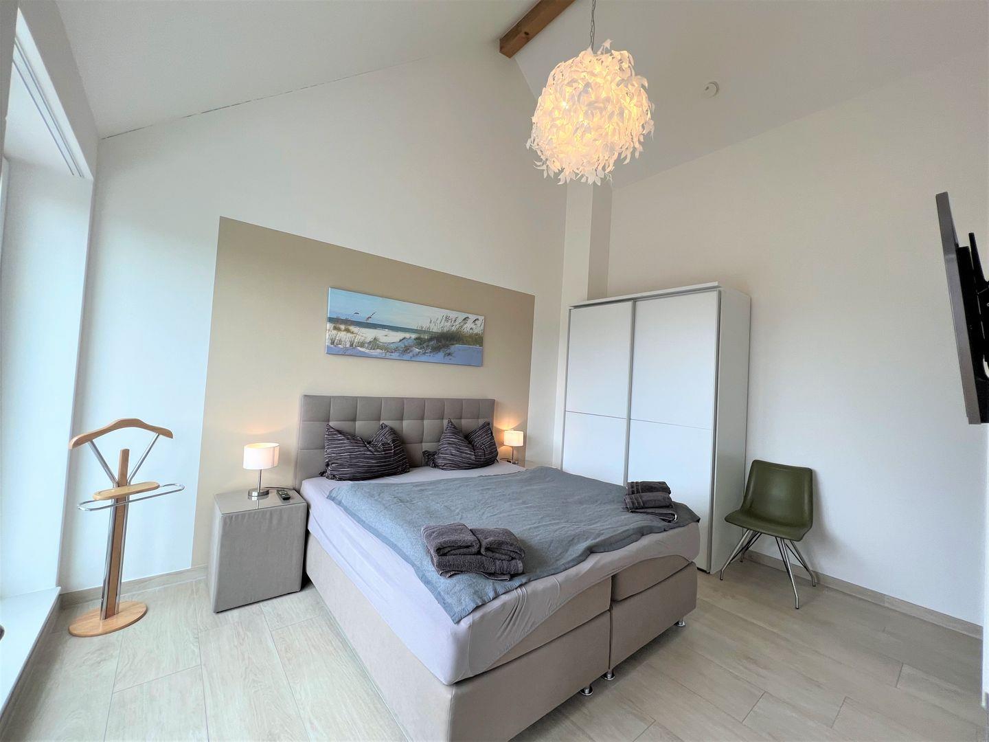 Schlafzimmer: 1 x Doppelbett, teilbar in zwei Einzelbetten (Maße: 180 x 200 cm bzw. 90 x 200 cm), 1x Doppel-Boxspringbett (180 x 200 cm), 1x Flat-TV, Leselampen, Kleiderschrank, Bettwäsche auf Anfrage