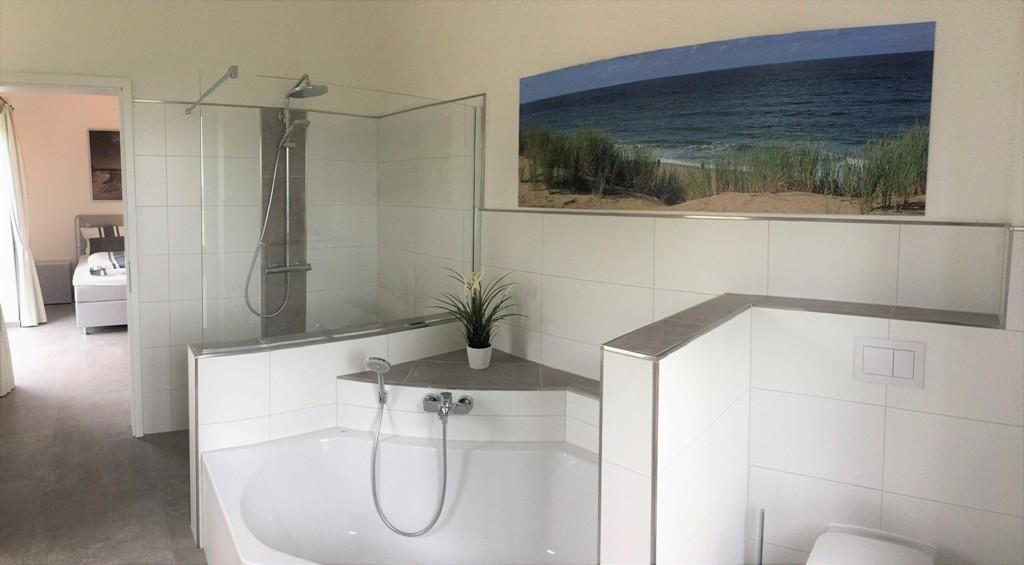 Vom Elternschlafzimmer geht es zum eigenen Traumbad mit großer, begehbarer Sommerregendusche und einer großen Eckbadewanne. Der beleuchtete, große Spiegel über dem Waschtisch und das integrierte Radio vollenden das harmonische Gesamtbild. Auch hier verfügen Sie über einen ausgezeichneten Blick auf das Wattenmeer.