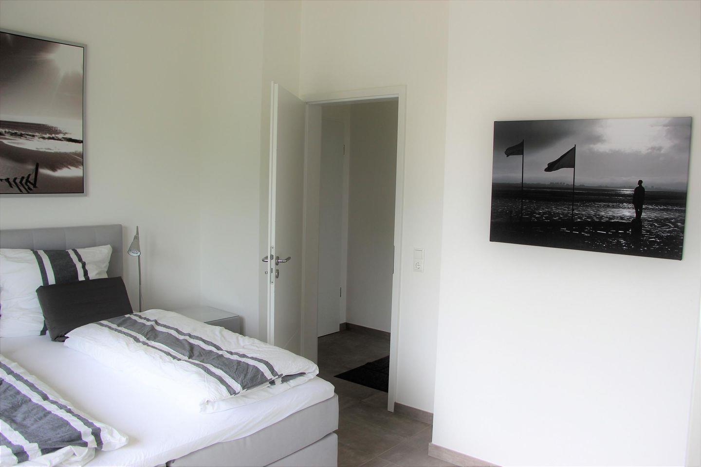 Das Elternschlafzimmer rechts vom Eingang mit großem Doppel-Boxspringbett bietet viel Tageslicht, ist aber dank beschichteter Vorhänge schnell zu verdunkeln. Sogar vom Bett aus hat man einen traumhaften Blick auf den Jadebusen mit dem Leuchtturm Arngast. Ein schicker Kleiderschrank mit ausreichend Stauraum rundet das Angebot im Elternschlafzimmer ab.