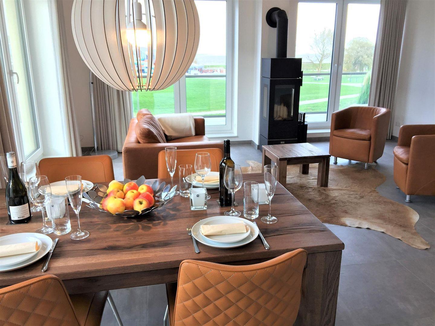 Sie gelangen über den Fahrstuhl oder über die Treppe in Ihr Domizil. Durch den Flur mit geschickt integrierter Garderobe geht es in den sehr stilvoll eingerichteten Wohn- und Essbereich mit hochwertiger Ledergarnitur und einem Holzkaminofen für kühlere Tage. Für Unterhaltung ist dank eines Flat-TV und eines CD/MP3-Players mit Bluetoothoption für Smartphones gesorgt. Eins ist sicher - hier erleben Sie Erholung pur! Für die warmen und sonnigen Tage können Sie auf der großzügigen Dachterrasse mit elektrischer Markise und hochwertigen Gartenmöbeln entspannen. Wie der Name schon verrät, haben Sie hier einen hervorragenden Panorama-Ausblick auf den Jadebusen - einfach magisch!