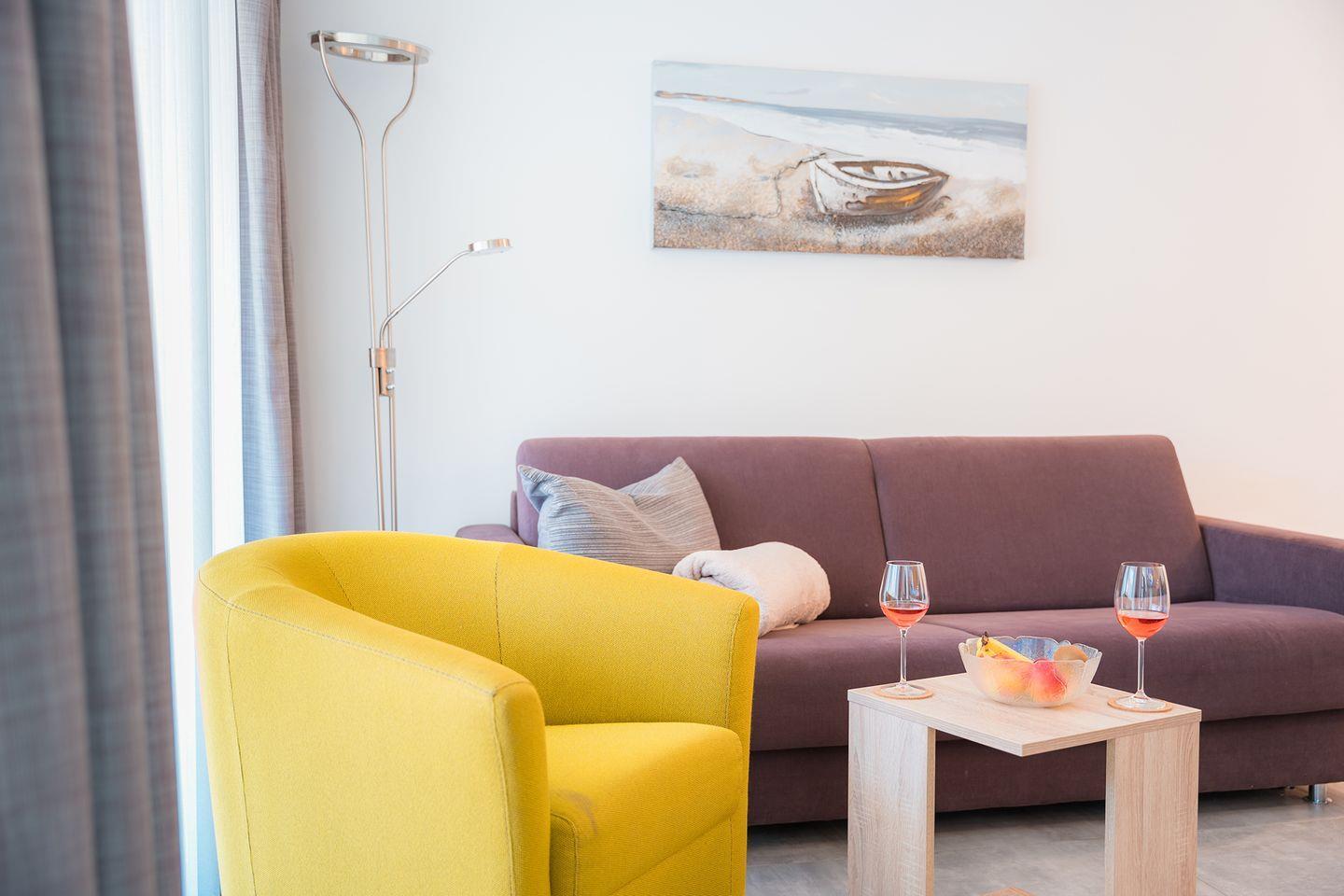 Vom Eingangsbereich mit Garderobe geht es in den gemütlichen Wohn- und Essbereich. Der kompakte Wohnbereich mit gemütlicher Couch und bequemen Sessel bietet ausreichend Platz zum Relaxen. Für die Nacht lässt sich die Couch zu einem vollwertigen Bett mit einer Liegefläche von 160 x 200 cm ausklappen. So erhöht sich die Anzahl der Schlafplätze auf 4 Personen.