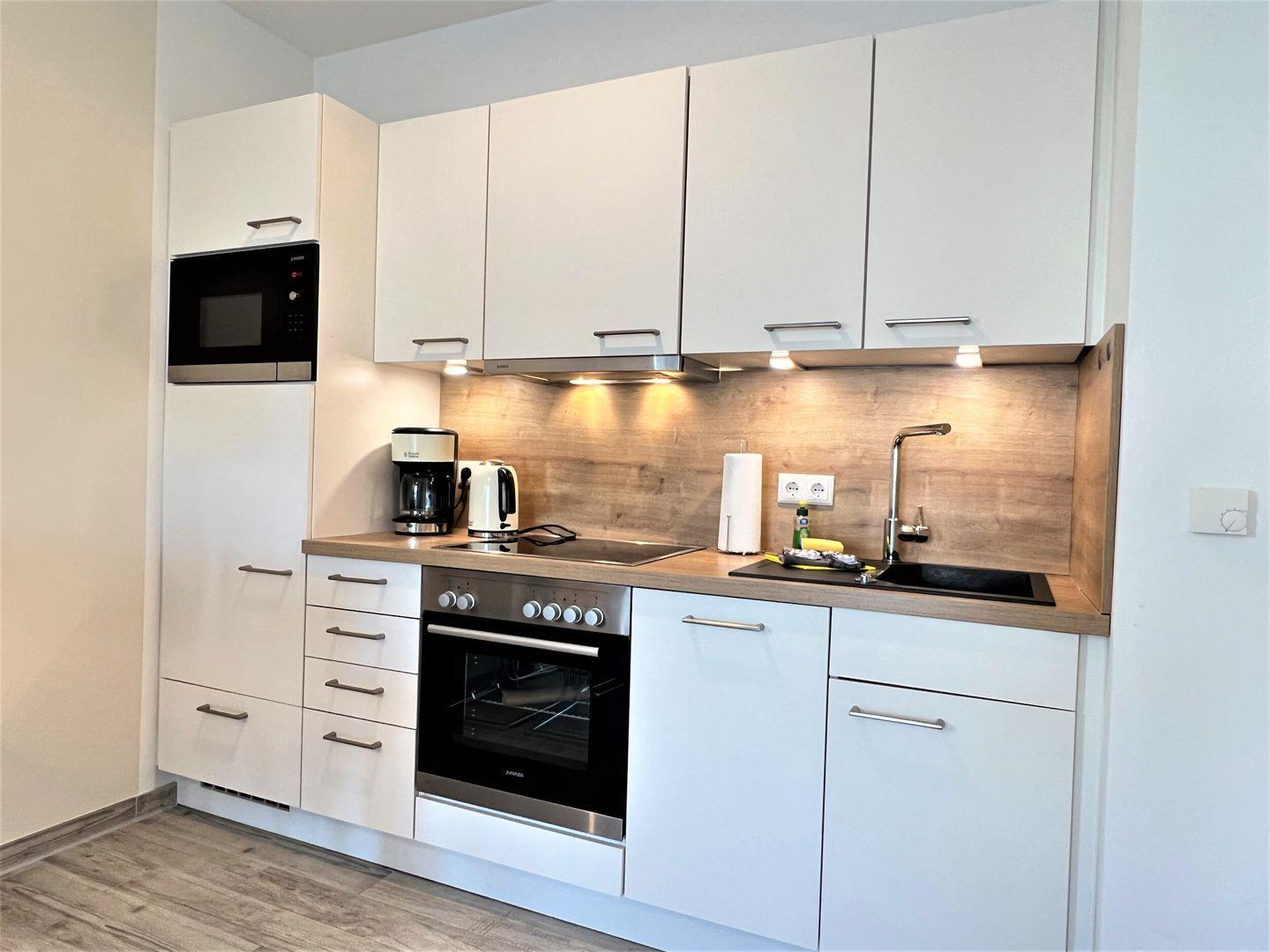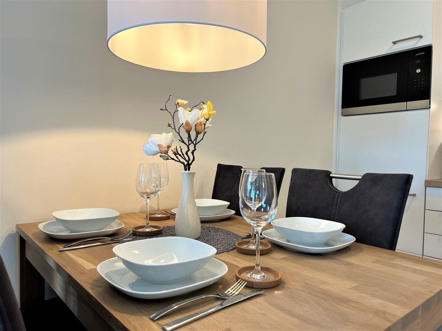 Küche und Haushalt: Einbauküche, Kühlschrank mit Gefrierfach, 4-Zonen Cerankochfeld, Backofen, Dunstabzugshaube, Mikrowelle, Geschirrspüler, Kaffeefiltermaschine, Toaster, Wasserkocher, hochwertiges Geschirr und Besteck