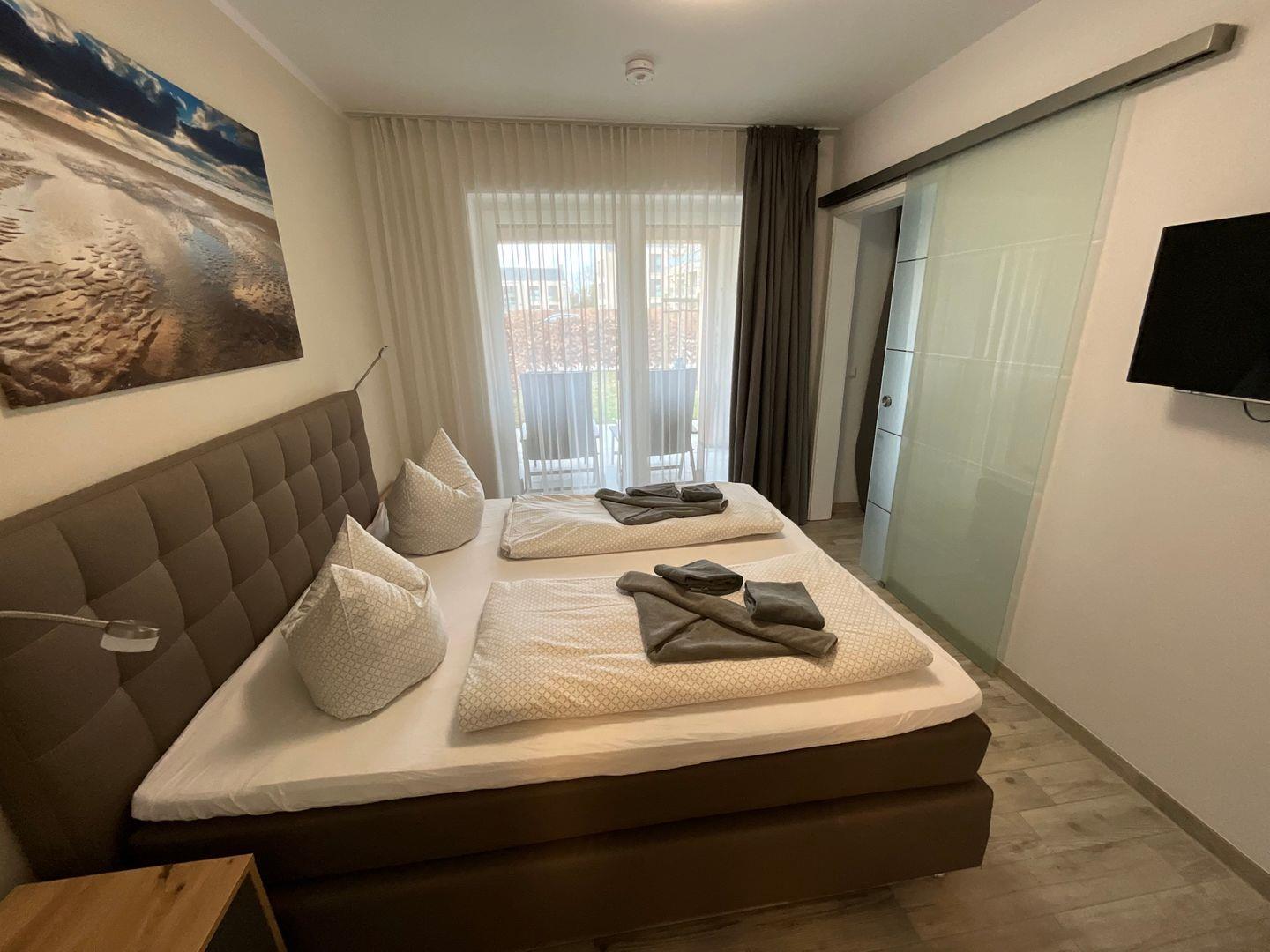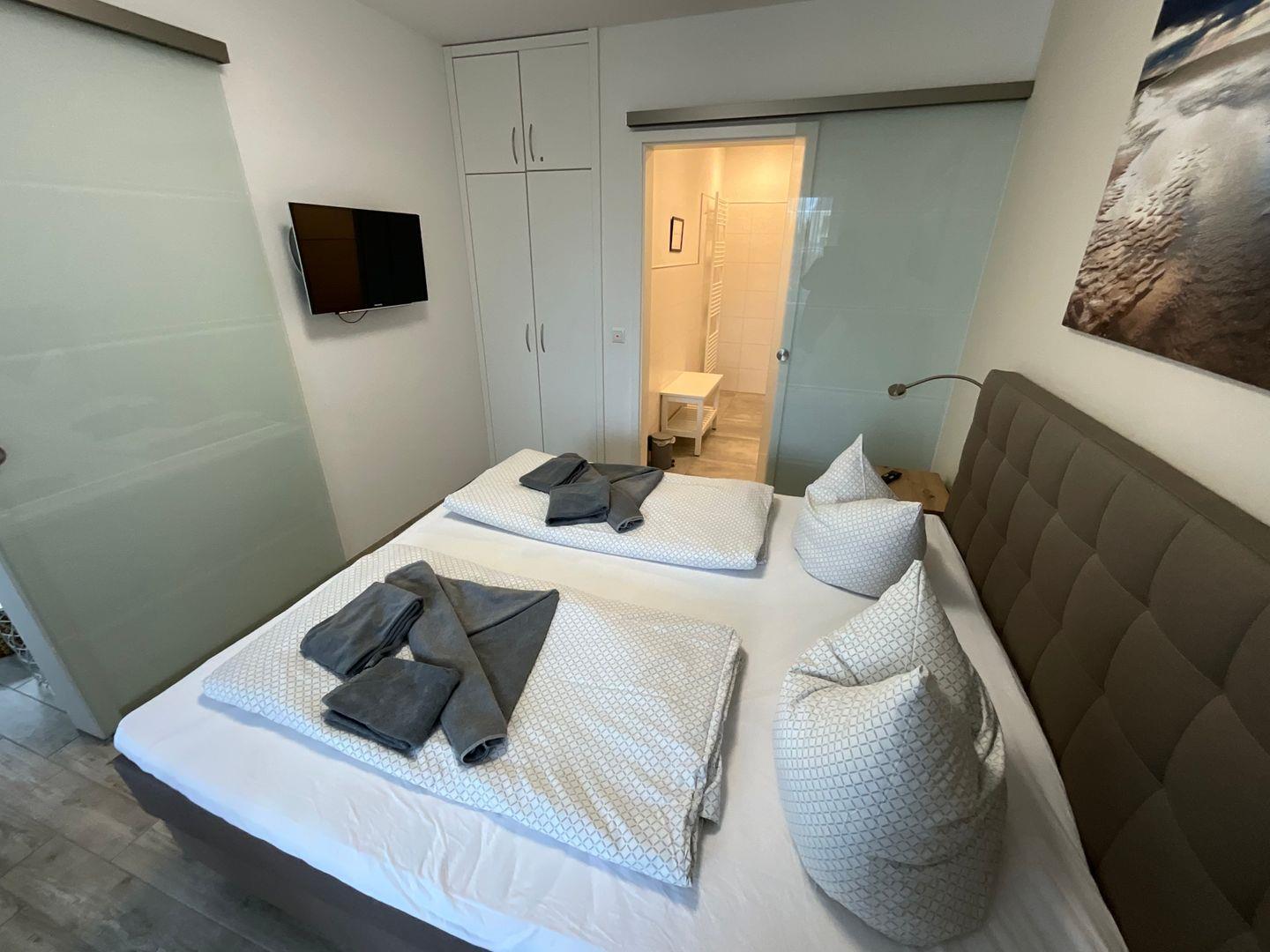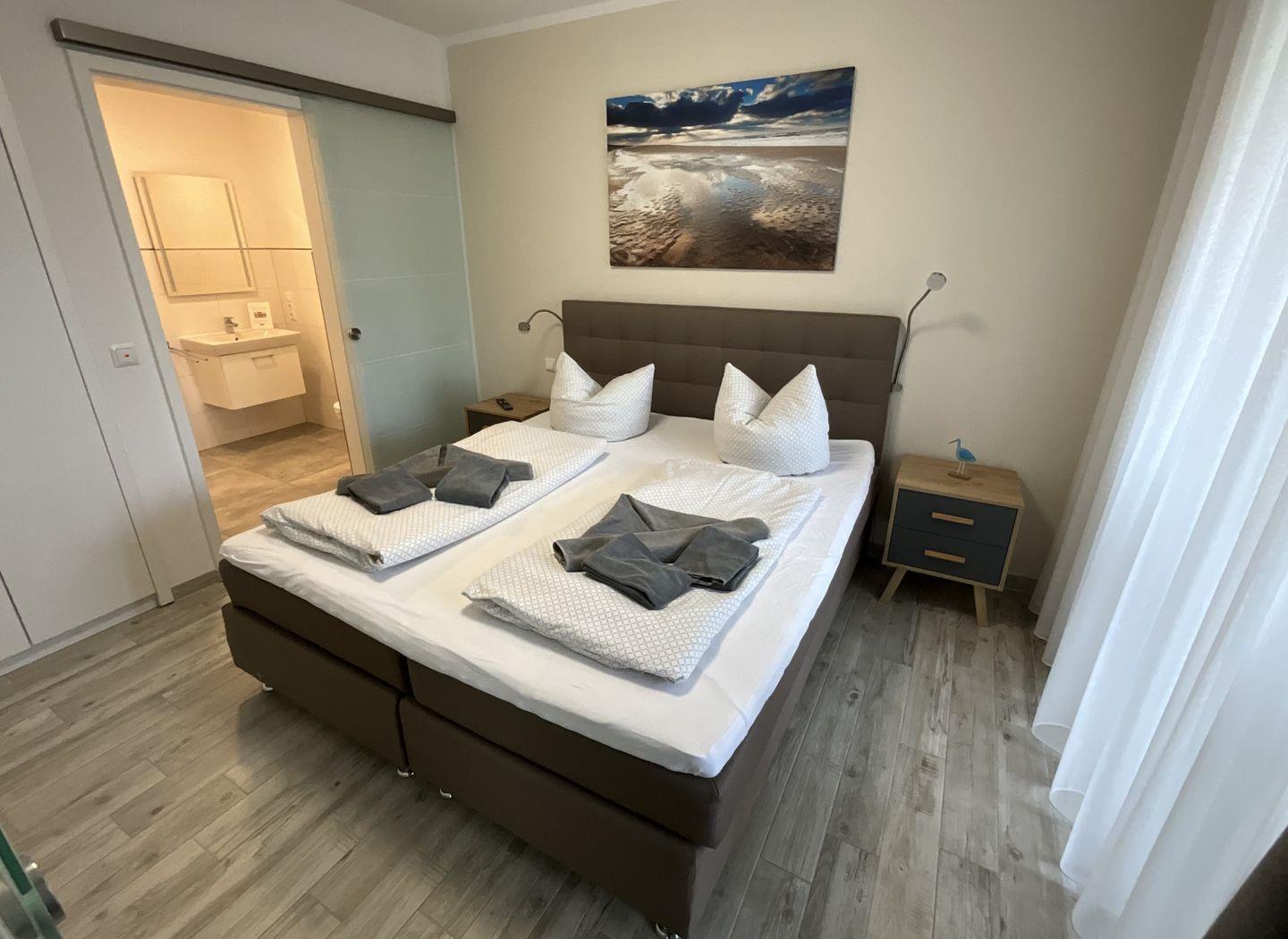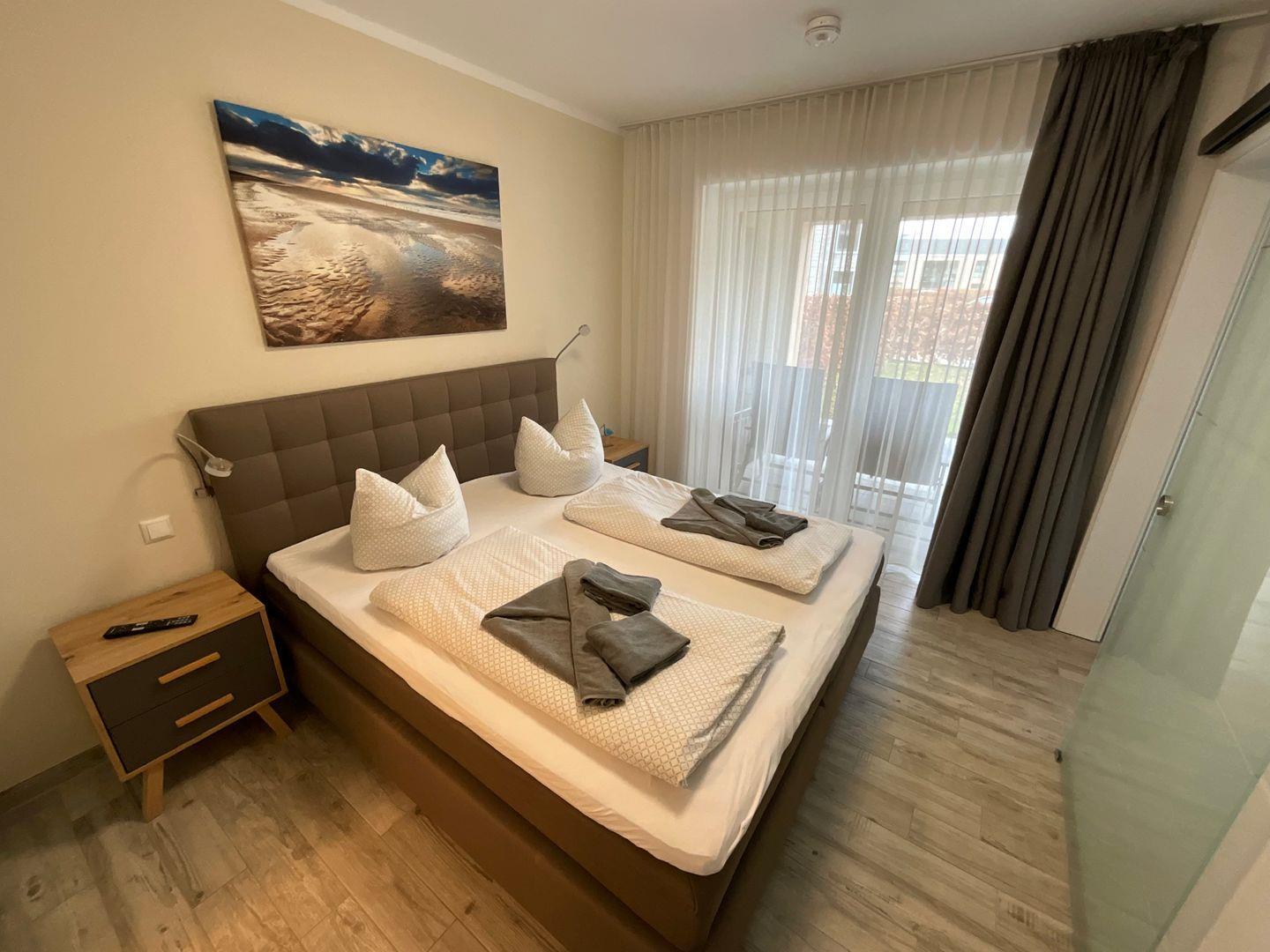 Über den Wohn-Essbereich gelangen Sie in Ihr persönliches Schlafzimmer. Das Schlafzimmer mit komfortablem Doppel-Boxspringbett und Kleiderschrank garantiert angenehme Träume. Von hier aus können Sie ebenfalls direkt auf die Terrasse gelangen.