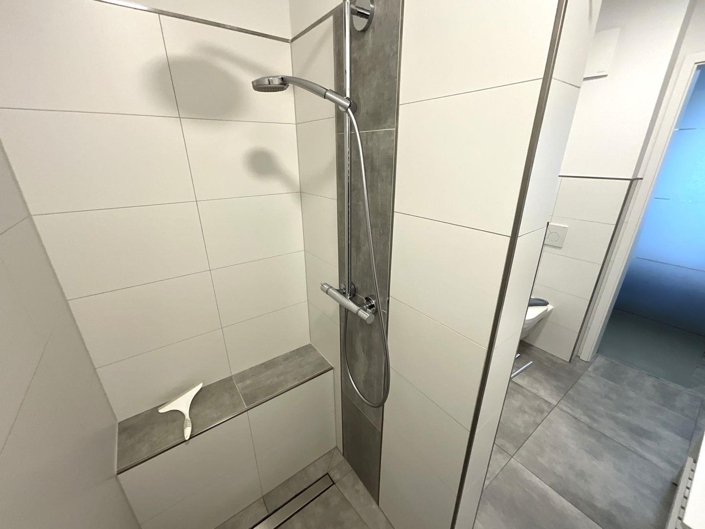 Vom Schlafzimmer geht es weiter zu Ihrem Duschbad mit WC, beleuchtetem Spiegel und begehbarer Sommerregendusche. Eine zusätzliche Ablagebank rundet das Angebot ab.
