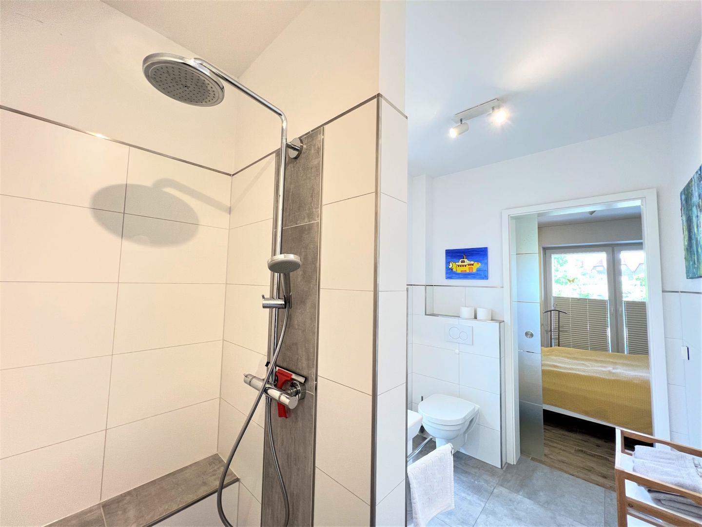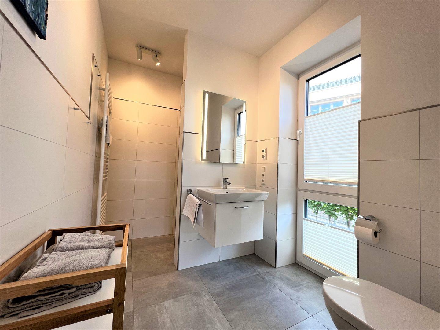 Bad und Sanitär: bodentiefe, barrierefreie Sommerregendusche, Waschtischanlage mit Spiegel, WC, Handtuchheizung, Fenster, Handtücher auf Anfrage