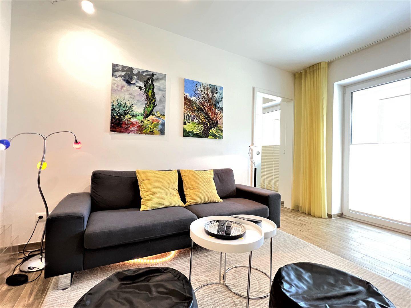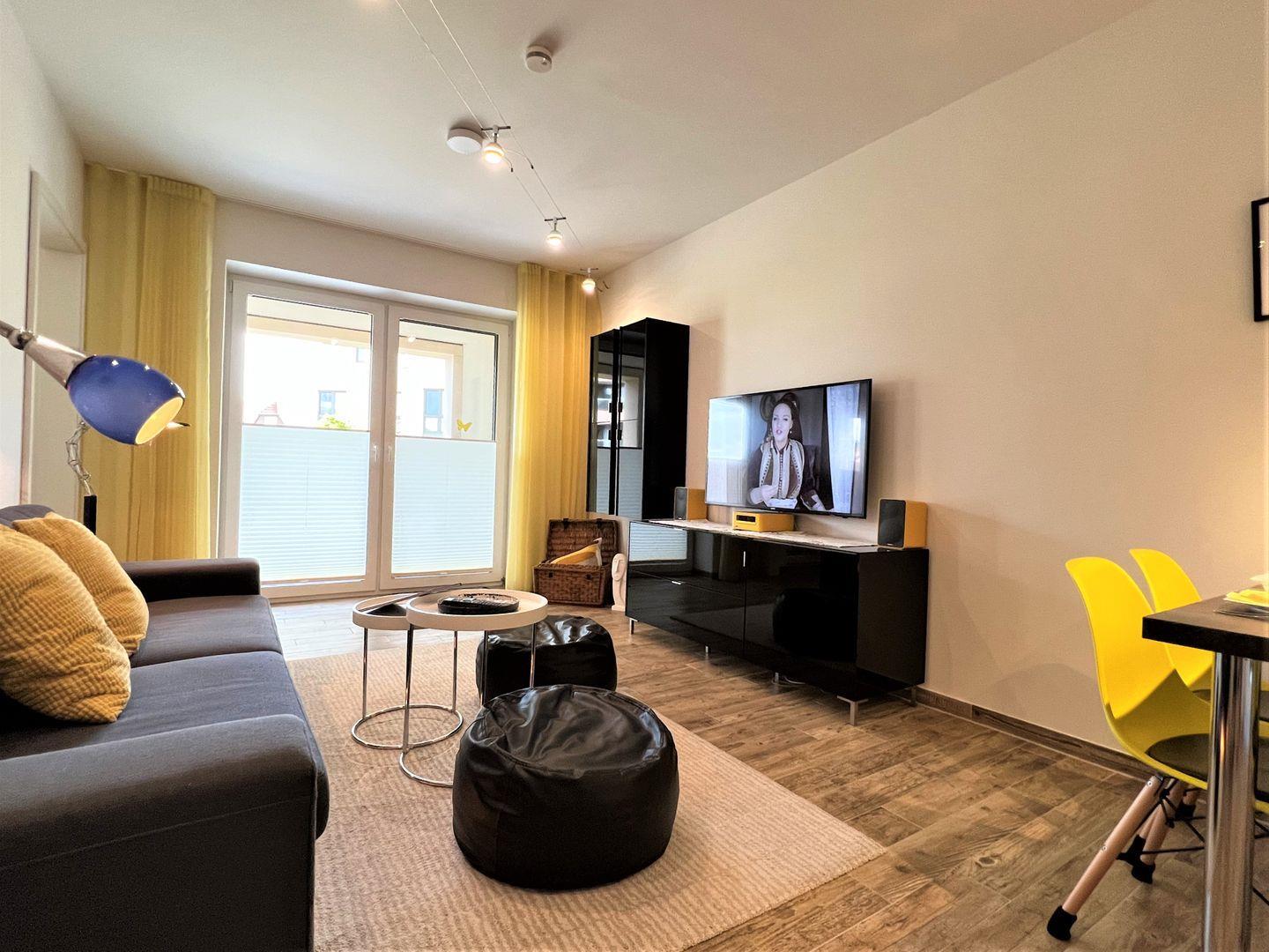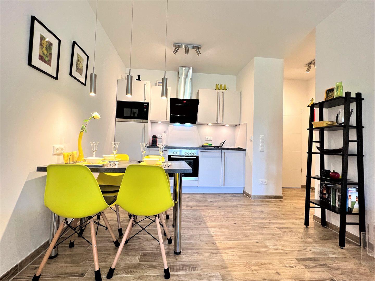 Vom Eingangsbereich mit praktischer Garderobe geht es in den offenen Wohn-Essbereich. Dieser überzeugt durch seine klare Linie mit knallig-gelben Akzenten und hochwertigem Mobiliar. Die offene und voll ausgestattete Küche stellt alles, was Sie zum Kochen und Zubereiten benötigen, zur Verfügung. Fließend und elegant verläuft der Übergang vom Essbereich zum Wohnbereich. Wo Sie auch hinschauen, bleibt dieses Apartment mit strahlend-gelben Farben ihrem Motto treu! Der Wohnbereich besticht durch seine bequeme Couch und dem hochwertigen Entertainment, bestehend aus großem Flat-TV und einer modernen HiFi-Anlagen. Hier gelangen Sie auf die große und teilüberdachte Süd-Ostterrasse mit wetterfesten Gartenstühlen mit verstellbarer Lehne und kleinem Gartenanteil.