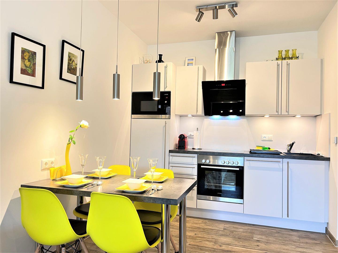 Küche und Haushalt: Einbauküche, Kühlschrank mit Gefrierfach, 4-Zonen Cerankochfeld, Backofen, Mikrowelle, Geschirrspüler, Kaffeefiltermaschine, Nespressomaschine, Toaster, Wasserkocher, hochwertiges Geschirr und Besteck