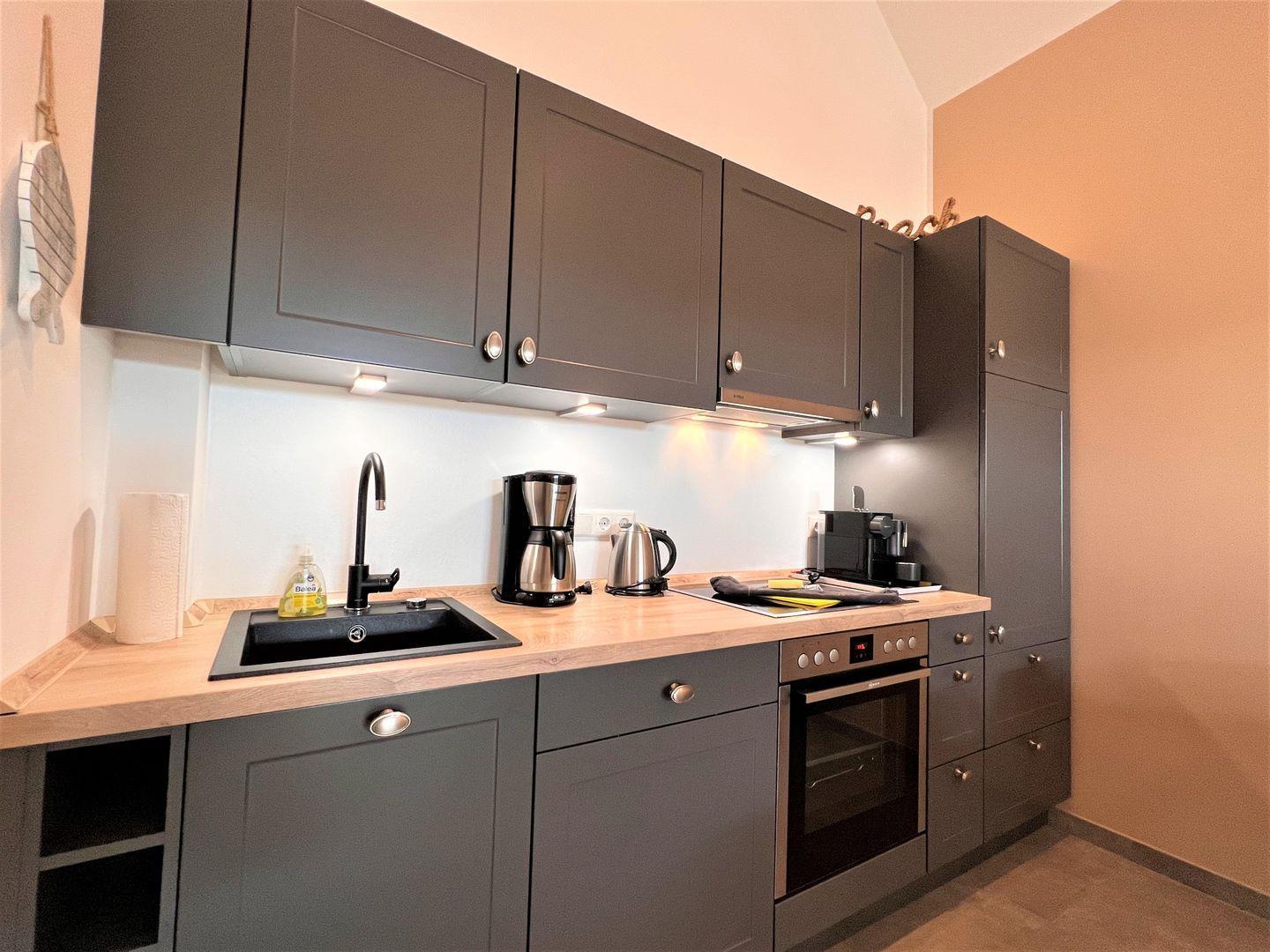 Küche und Haushalt: Einbauküche, Kühlschrank mit Gefrierfach, 4-Zonen Cerankochfeld, Backofen, Geschirrspüler, Kaffeefiltermaschine und Kapselmaschine, Wasserkocher, hochwertiges Geschirr und Besteck, Esstisch mit 4 Stühlen