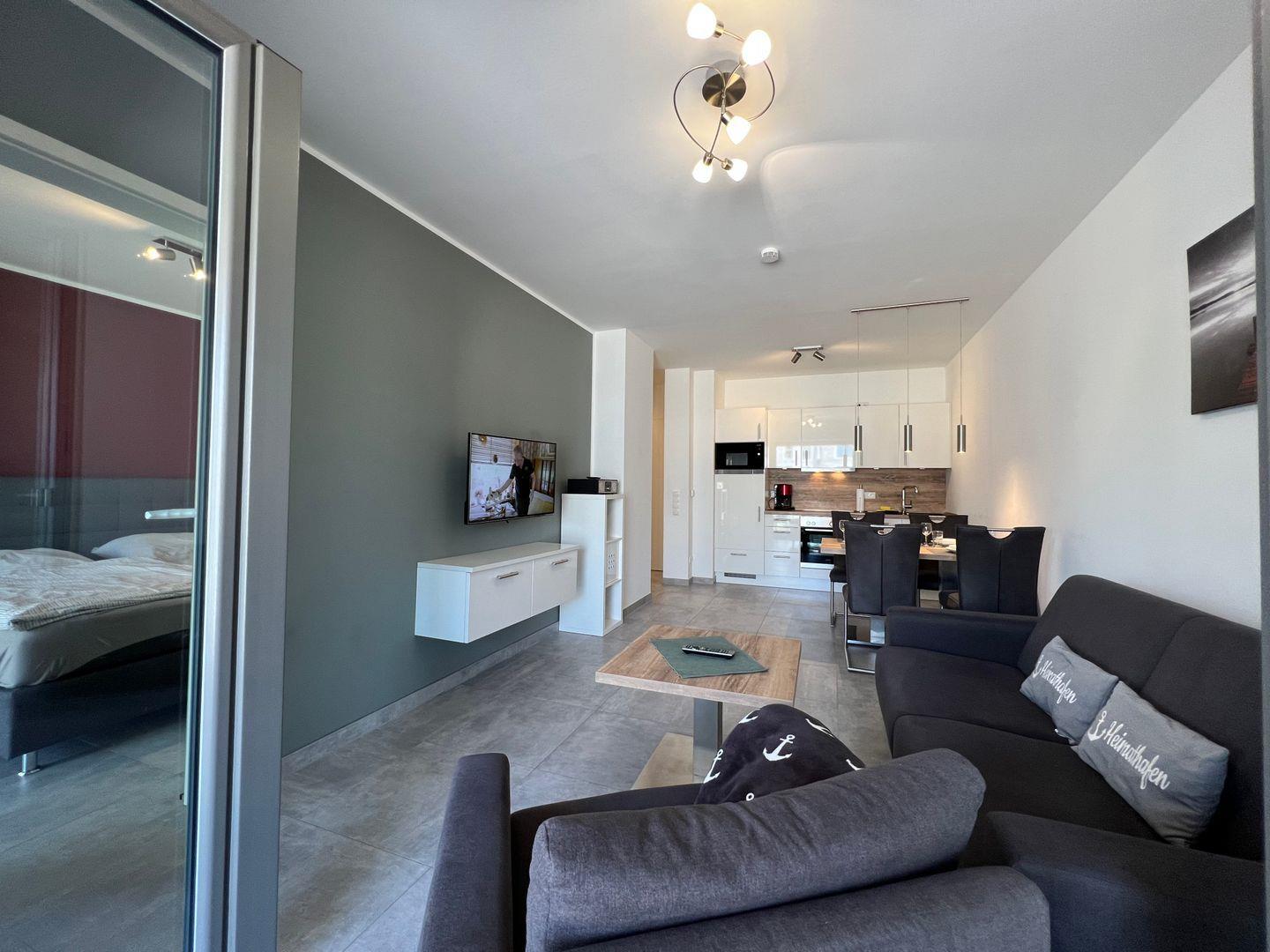 Durch den Eingangsbereich mit praktischer Garderobe gelangen Sie in den offenen Wohn-Essbereich. Dieser überzeugt durch hochwertiges und modernes Mobiliar. Die voll ausgestattete Küche aus Hochglanz ist mit besten und neuesten Geräten ausgestattet. Das Sofa mit Schlaffunktion bietet einer 3. Person gern zusätzlichen Platz. Ein großer Flat-TV sorgt für beste Unterhaltung. Von hier aus gelangen Sie auf den großen Westbalkon mit einer gemütlichen Sitzecke und Liegen. Jedoch ist der Zugang zum Balkon nur über eine innenliegende Stufe zugänglich.
