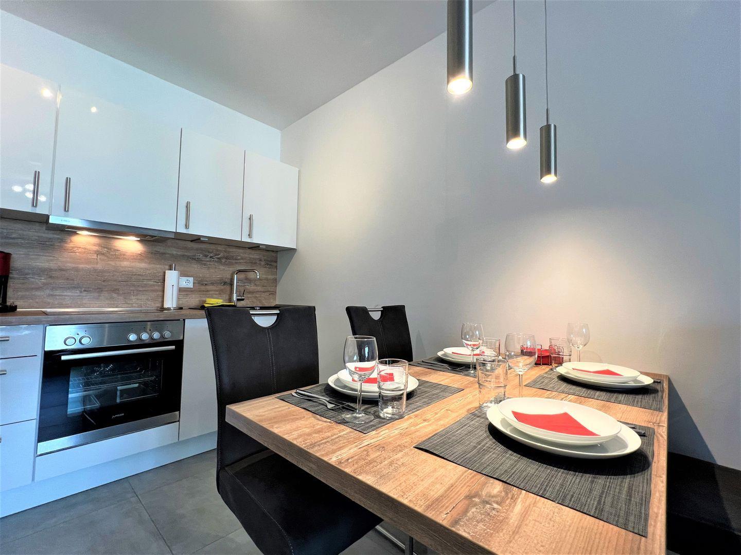 Küche und Haushalt: Einbauküche, Kühlschrank mit Gefrierfach, 4-Zonen Cerankochfeld, Backofen, , Mikrowelle, Geschirrspüler, Kaffeefiltermaschine, Toaster, Wasserkocher, hochwertiges Geschirr und Besteck, Esstisch mit 4 Stühlen