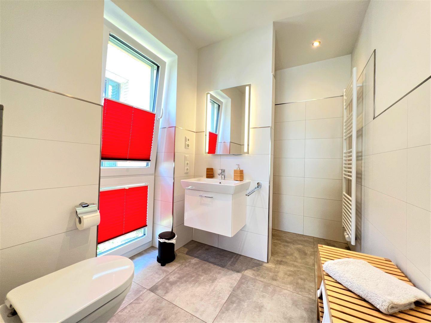 Bad und Sanitär: bodentiefe, barrierefreie Dusche, Waschtischanlage mit beleuchtetem Spiegel, WC, Handtuchheizung, Föhn