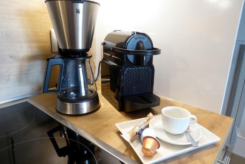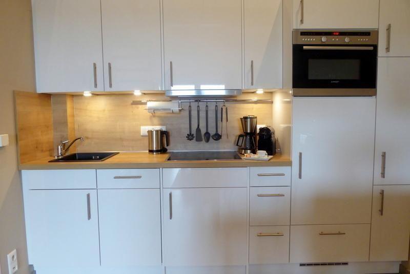 Küche und Haushalt: Einbauküche, Kühlschrank mit Gefrierfach, 4-Zonen Cerankochfeld, Mikrowellen-Backofen-Kombi, Dunstabzugshaube, Waschmaschine, Geschirrspüler, Filterkaffeemaschine, Nespresso, Toaster, Wasserkocher, hochwertiges Geschirr und Besteck