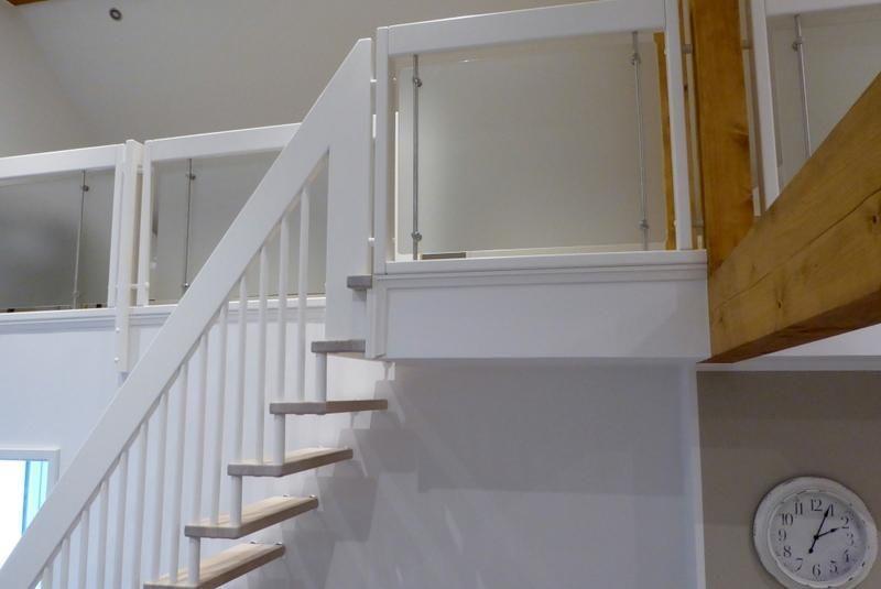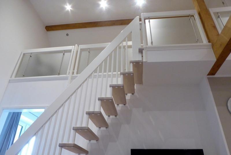 Das Highlight ist die offene Raumspartreppe, die zum Schlafbereich für insgesamt zwei weitere Personen führt und sich zum Wohn-Essbereich offen darstellt.
