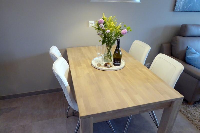 Vom Eingangsbereich gelangen Sie in den offenen Wohn-Essbereich, der durch helle Farben und warme Blautöne überzeugt und seine Gäste förmlich umarmt. Die mit besten Markengeräten voll ausgestattete Küche schließt direkt an den Essbereich an. Farblich stimmig und sympathisch eingerichtet zeigt sich der Wohnbereich mit Couch und Sessel. Von dort gelangen Sie auf die große überdachte Westloggia mit modernen Gartenmöbeln und Liegen. Diese ist über eine Stufe erreichbar und daher nicht rollstuhlgerecht.