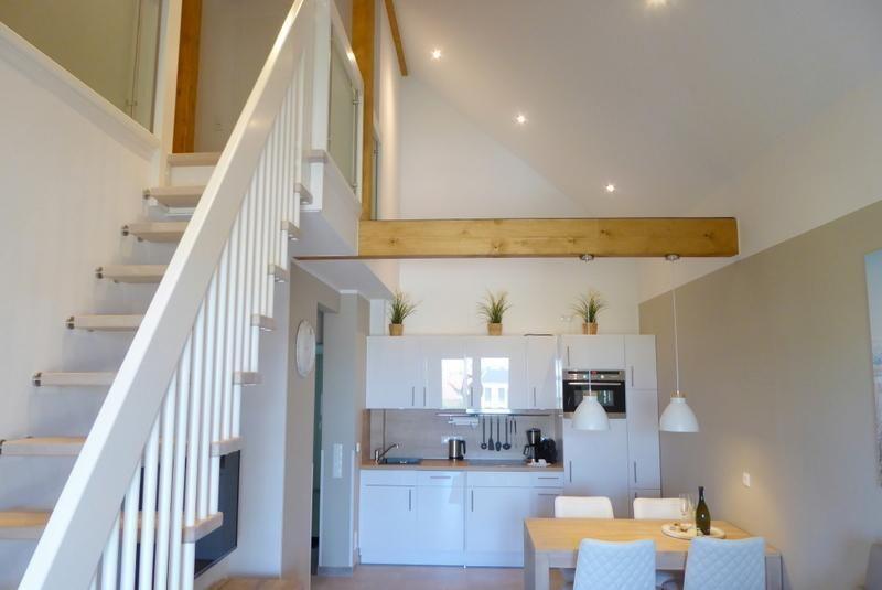 Das Apartment "Watt´n Glück" lädt Sie zu einem Urlaub mit der ganzen Familie ein. Das Apartment nutzt die bis zu 6m hohen Decken und lässt 2 weiteren Schlafplätzen Raum in der zweiten, freischwebend wirkenden Ebene im Wohnzimmer mit Galeriecharme.