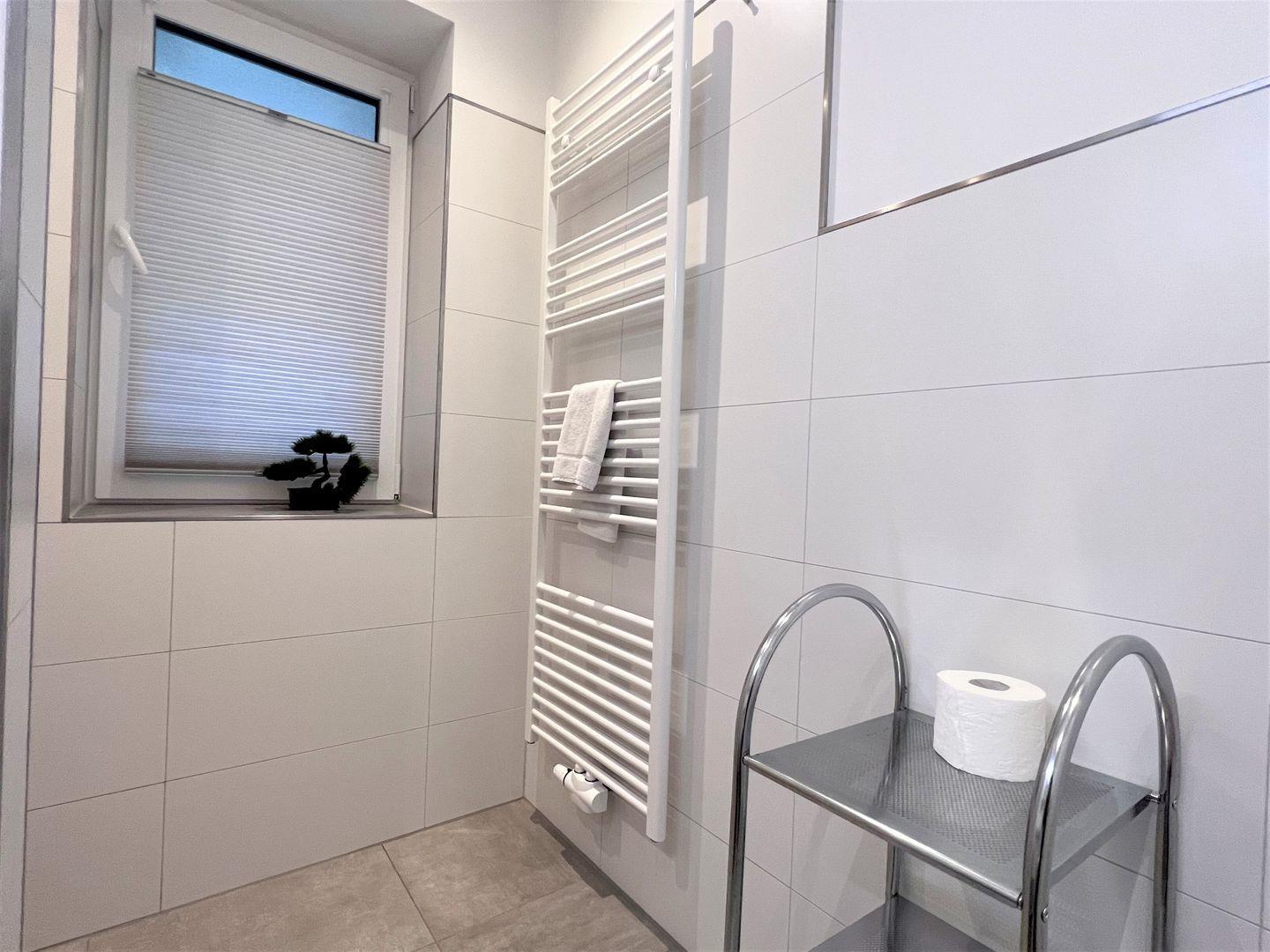 Bad: großzügiges Badezimmer mit Regendusche, Handtuchheizung, Spiegelschrank