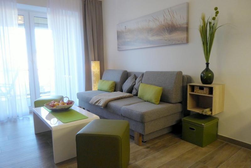 Am massiven Esstisch mit Leder-Freischwingern kann man gemütlich frühstücken oder auch mit Freunden einen Spielabend verbringen. Die kleine, vollständig ausgestattete Markenküche liegt offen zum Wohn-Essbereich. Im Wohnzimmer lädt das große, gemütliche Sofa zum Lesen, Fernsehen oder Musik hören ein. Am 55"-Flachbildfernseher ist eine Magnat-Soundbar angeschlossen, über die Sie auch Radio oder Ihre Lieblingsmusik via Bluetooth vom Smartphone oder Tablet hören können. Durch eine breite Terrassentür gelangen Sie direkt auf den großzügigen und überdachten Balkon mit Süd-Westausrichtung. Dieser ist über eine Stufe erreichbar und daher nicht rollstuhlgerecht.